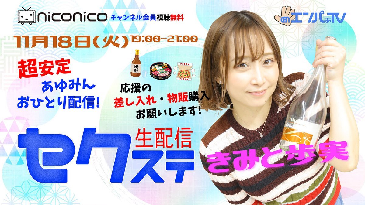 【お知らせ】 あゆみんおひとり配信 ! 皆さんからの差し入れ飲んで食べて泥酔トーク 今回もたくさんの差し入れで盛り上げてくださいね! #セクステ 生配信 11/18(火)1900-210 #きみと歩実 詳細&差し入れ/物販購入&視聴 ↓11/11(火)21時発売 empatvfes.wixsite.com/empaproject/st… pic.x.com/cGskQwnJpY
