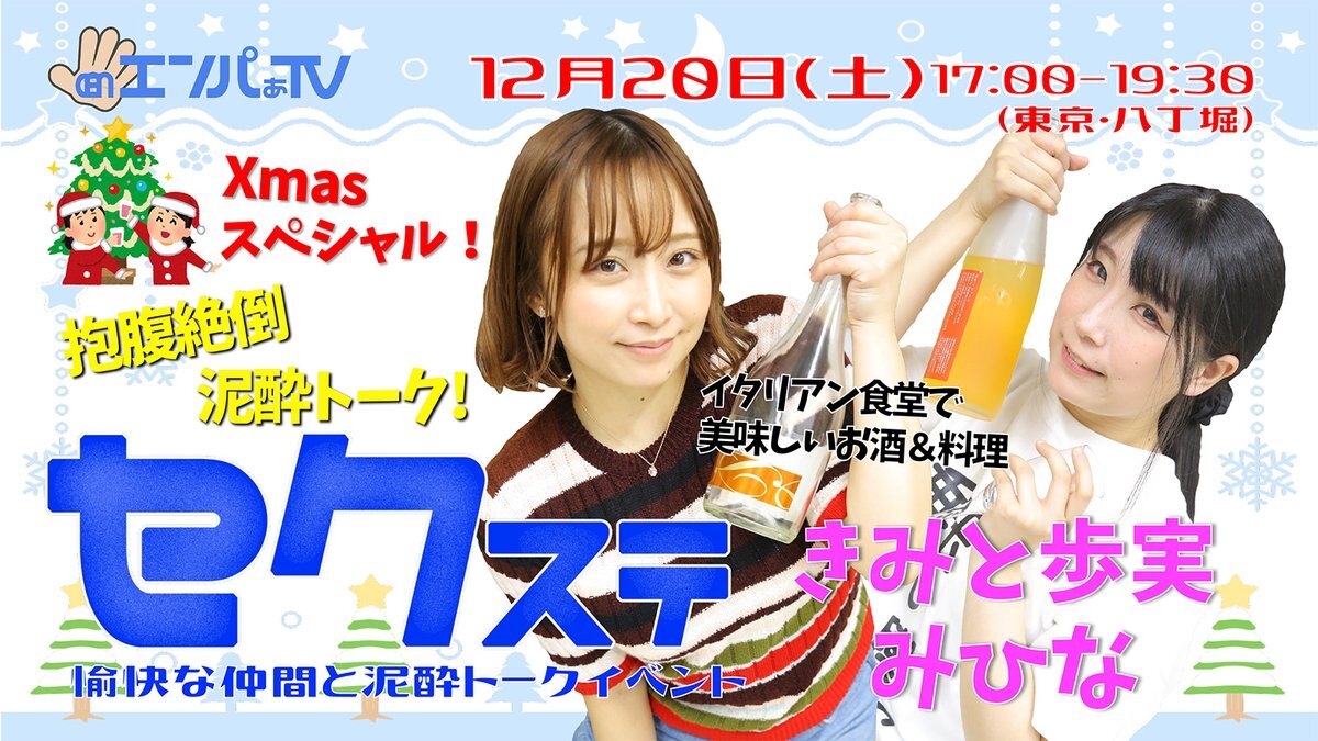 📢発売しました! ↓詳細&チケット&WEB物販 empatvfes.wixsite.com/empaproject/st… 🎄Xmasスペシャル お酒と料理を楽しみながらの泥酔トークイベント シャレた🎁を用意してお待ちしています #セクステ 12/20(土)17:00 東京・八丁堀 飲み放題/フード付 #きみと歩実 #みひな pic.x.com/GL5Elkqrc3