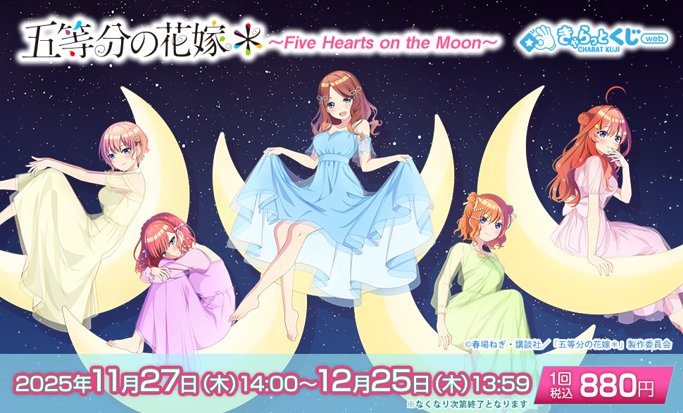 ┏━━━【 #きゃらっとくじweb 】━━━┓ WEBからもお気軽にお求めやすく🌙 TVスペシャルアニメ「#五等分の花嫁*」 ~Five Hearts on the Moon~ ┗━━━━━━━━━━━━━━━━━━┛ 11/27(木)14時より販売スタート📢 🔗詳細はコチラ x.gd/96xo9 pic.x.com/kpiDbj9O9M