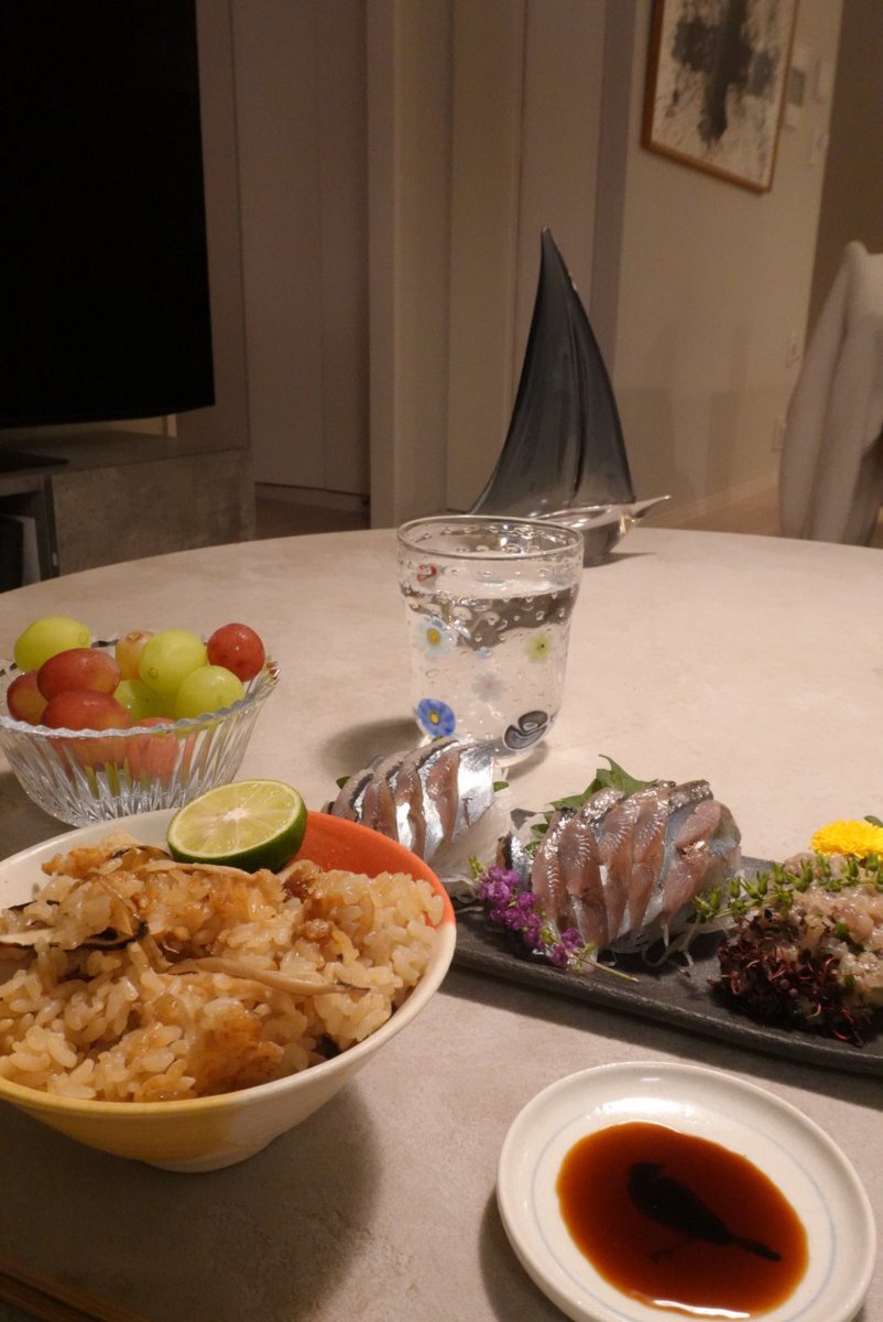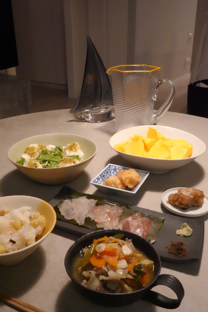 お刺身の昆布じめ えびてん 唐揚げののこり 水菜サラダ 豚汁 さつまいもご飯 柿 #おうちごはん𓎩𓌉 #きょうのごはん #料理好きな人と繋がりたい #自炊記録 #同居人ごはん pic.x.com/ukceR8WjXv