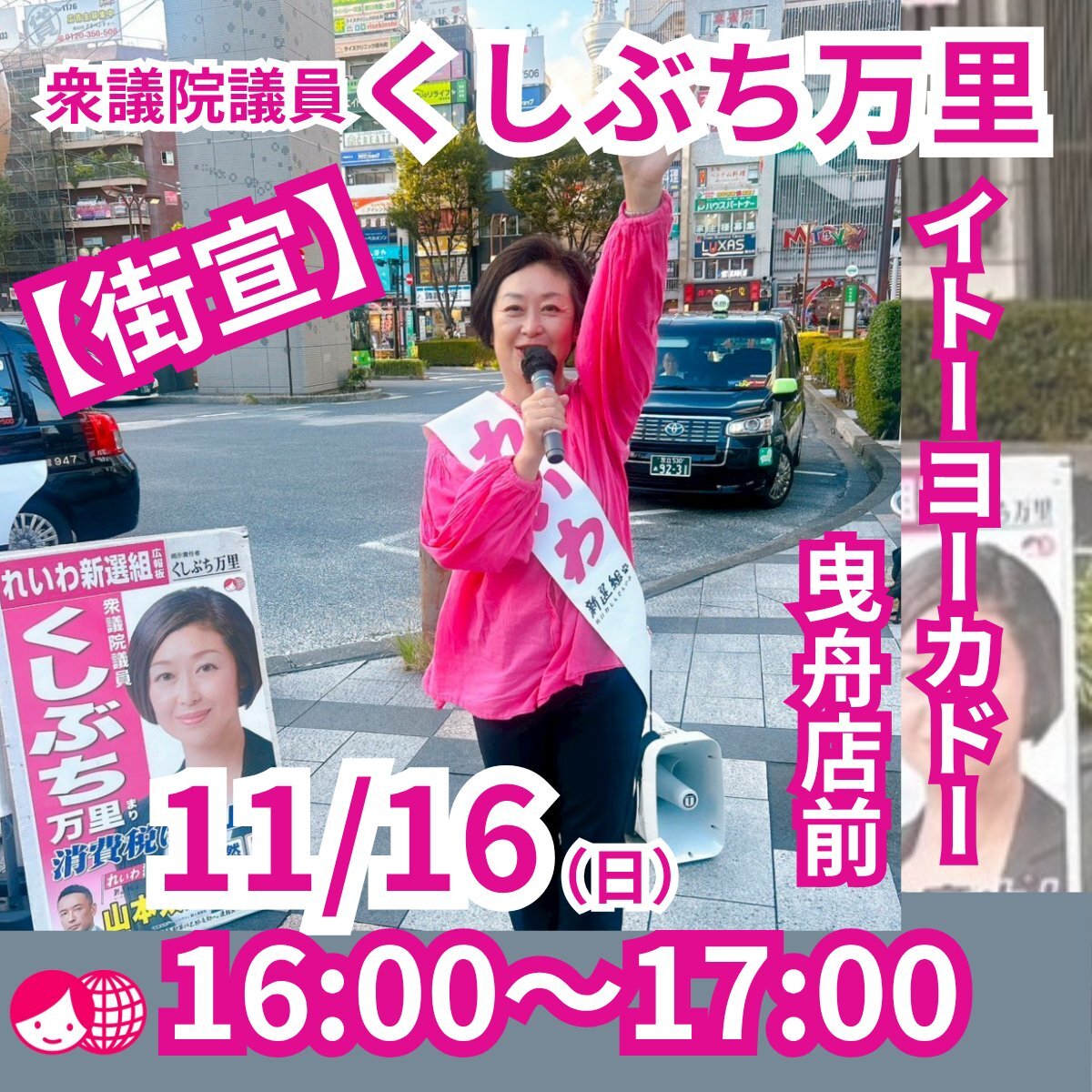 📣くしぶち万里 街宣📣 本日‼️ 11月16日(日)16:00~17:00 場所:イトーヨーカドー曳舟店前 / 責任ある積極財政とは、みんなのお財布にお金が届くこと \ / 非核三原則で、徹底的な平和外交を! \ 👚一緒にチラシを配っていただける ボランティアさん大募集です👚 #れいわ新選組