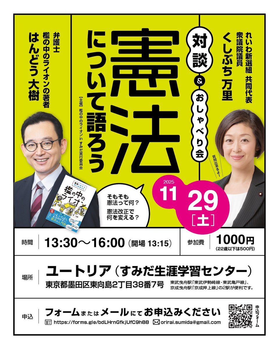 11月29日まで2週間。 はんどうさん、くしぶちさんとの憲法についての対談とおしゃべり会。是非参加お待ちしております。 会場から徒歩20分でスカイツリーや隅田川へ足を運ぶのも良いですよー👍️ #はんどう大樹 #くしぶち万里 #おしゃべり会 pic.x.com/l48jKBkA6l x.com/handotaiki/sta…