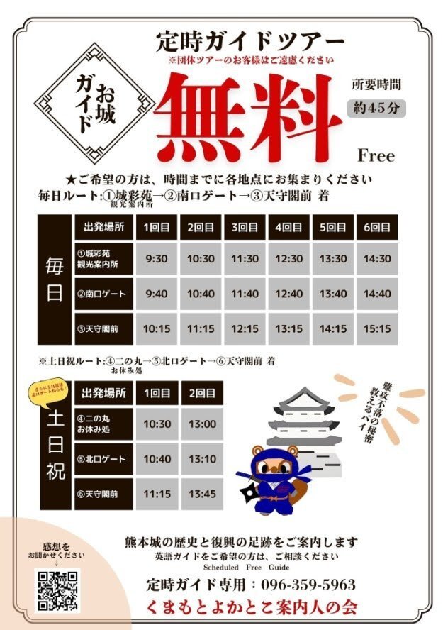 本日(9月1日)より、熊本城の定時ガイドツアーは午後も実施します。 🔴定時ガイド🔴 【南口ルート】9:30 /10:30 /11:30 /12:30 /13:30 /14:30(毎日) 【北口ルート】10:30 /13:00(土日祝のみ) #くまもとよかとこ案内人の会 #熊本城