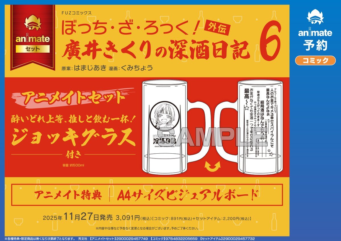 【書籍予約情報】 11/27発売予定 『#ぼっち・ざ・ろっく!外伝 廣井きくりの深酒日記(6) アニメイトセット【酔いどれ上等、推しと飲む一杯! ジョッキグラス付き】』 ✨予約受付中ナノ✨ #はまじあき 先生 #くみちょう 先生 🔽レジにてバーコード表示で簡単予約🔽 animate-onlineshop.jp/pn/%E3%80%90%E… pic.x.com/fE80ef1Cgt