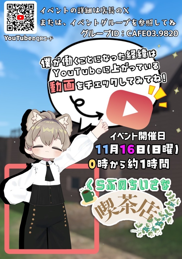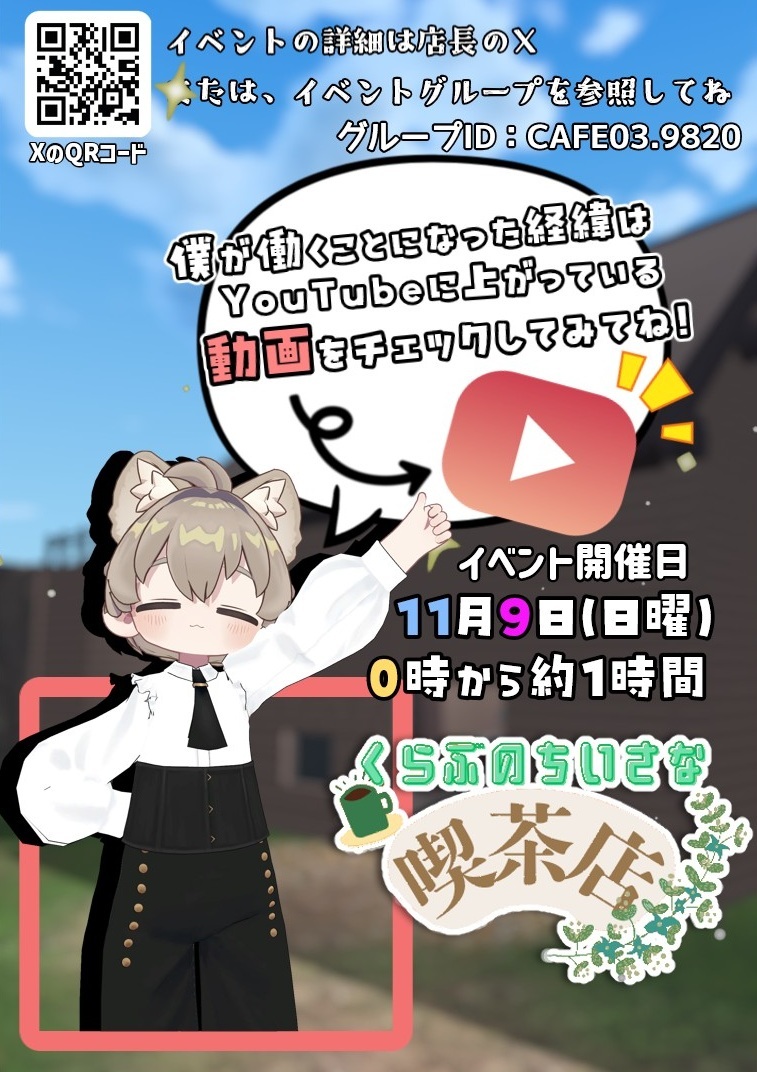 イベント告知だよ♪ くらぶの小さな喫茶店(Lv28)は 11月16日の0時から1時までの約1時間の経営だよ!のんびりまったりお話したい人、是非予定空けて遊びに来てね~! ※パブリックで使っちゃマズいようなアバターでの入店は勘弁してね? #VRChatイベント #VRChat #くらぶの小さな喫茶店 pic.x.com/OYixBVn7BE