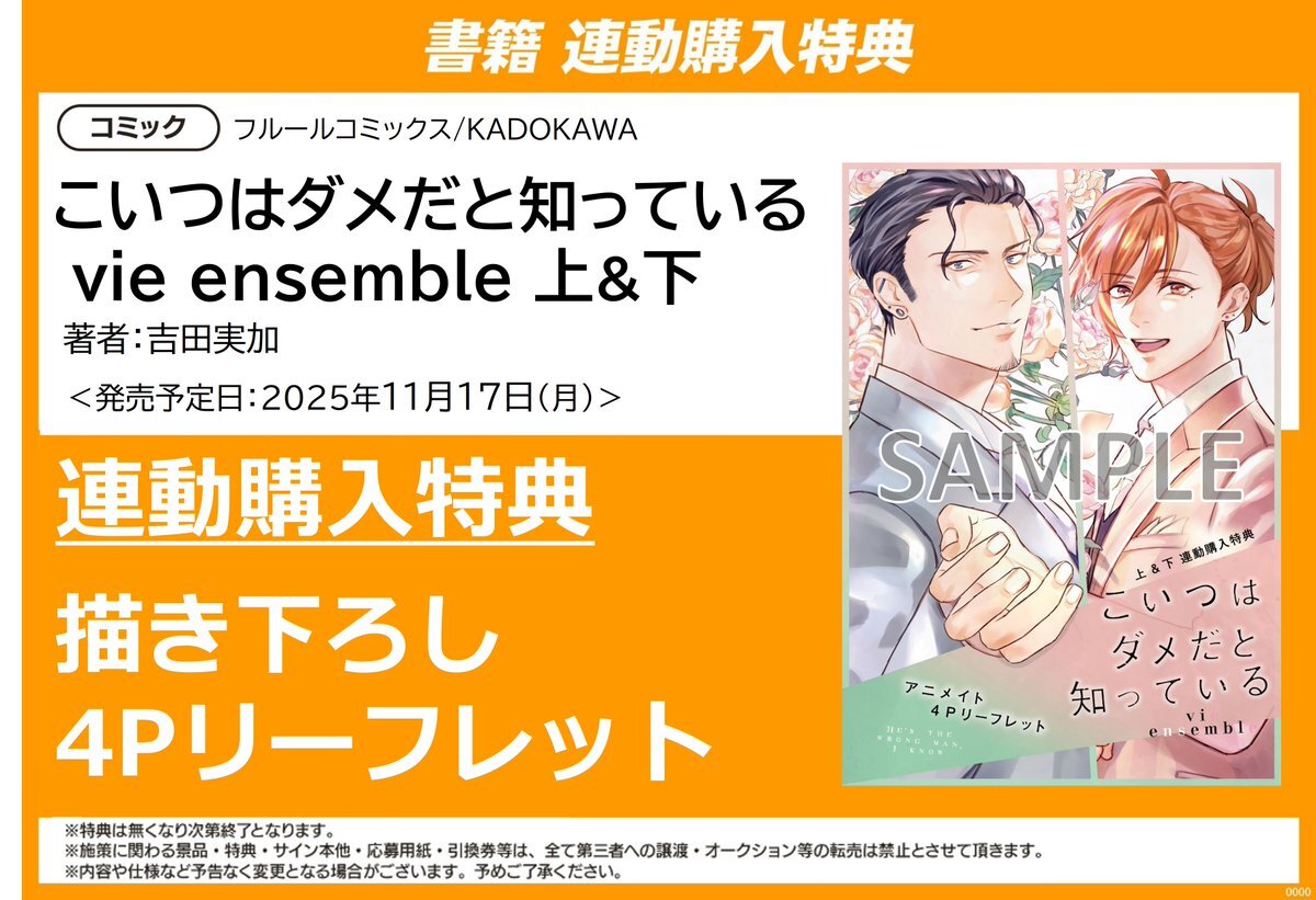 【新刊入荷情報】 フルールコミックス 吉田実加先生 「#こいつはダメだと知っている vie ensemble(上)(下)」 入荷ぜよ! 上下巻をを連動でお買い上げいただいた方に、先着で【B6サイズ4Pリーフレット】をプレゼント🎁 pic.x.com/zbrRC90EB1