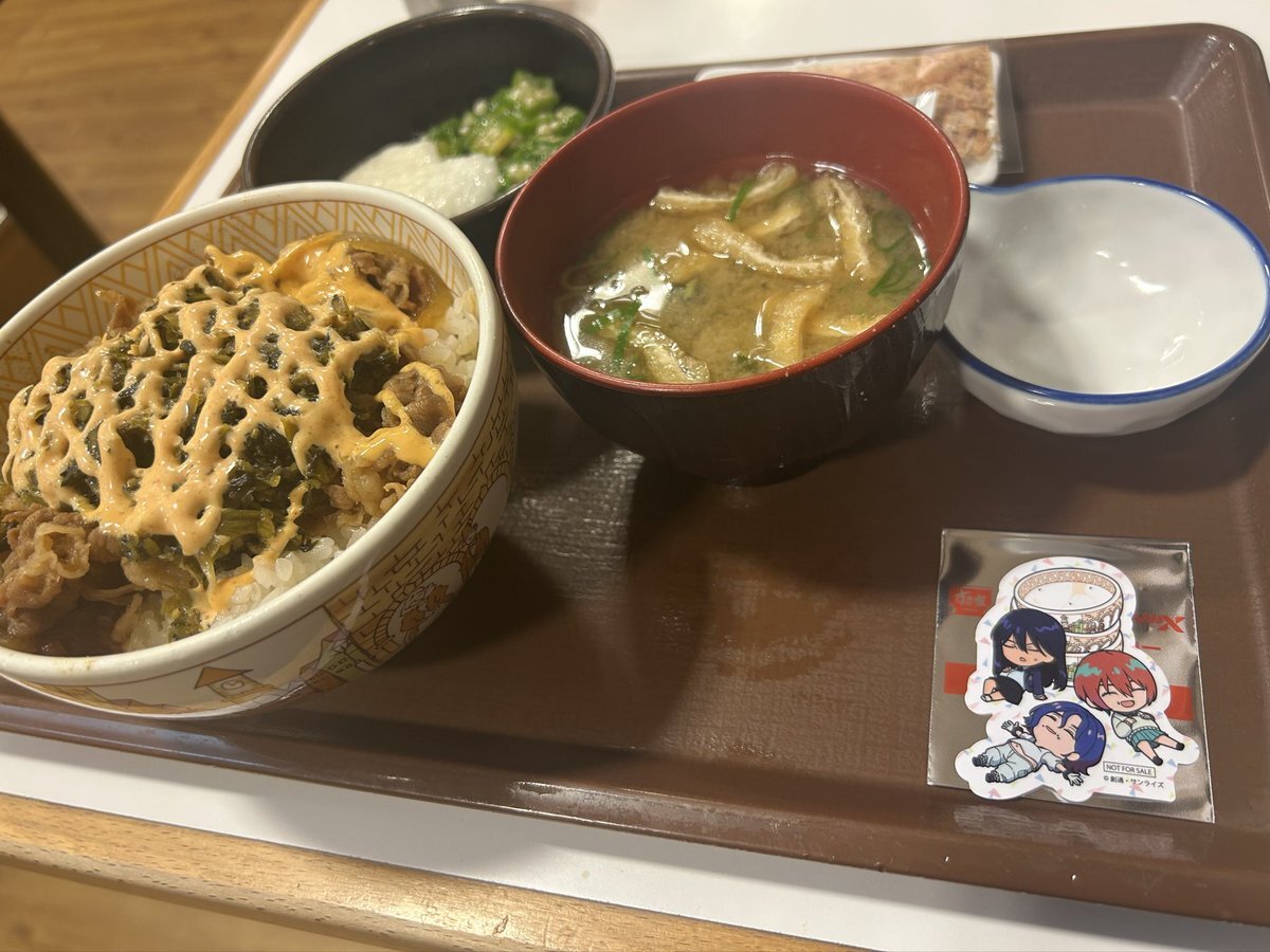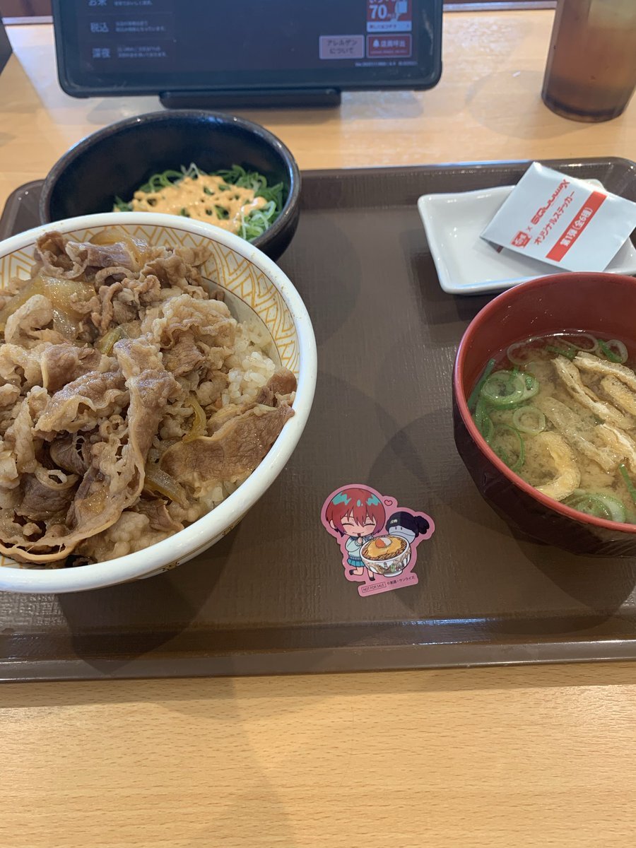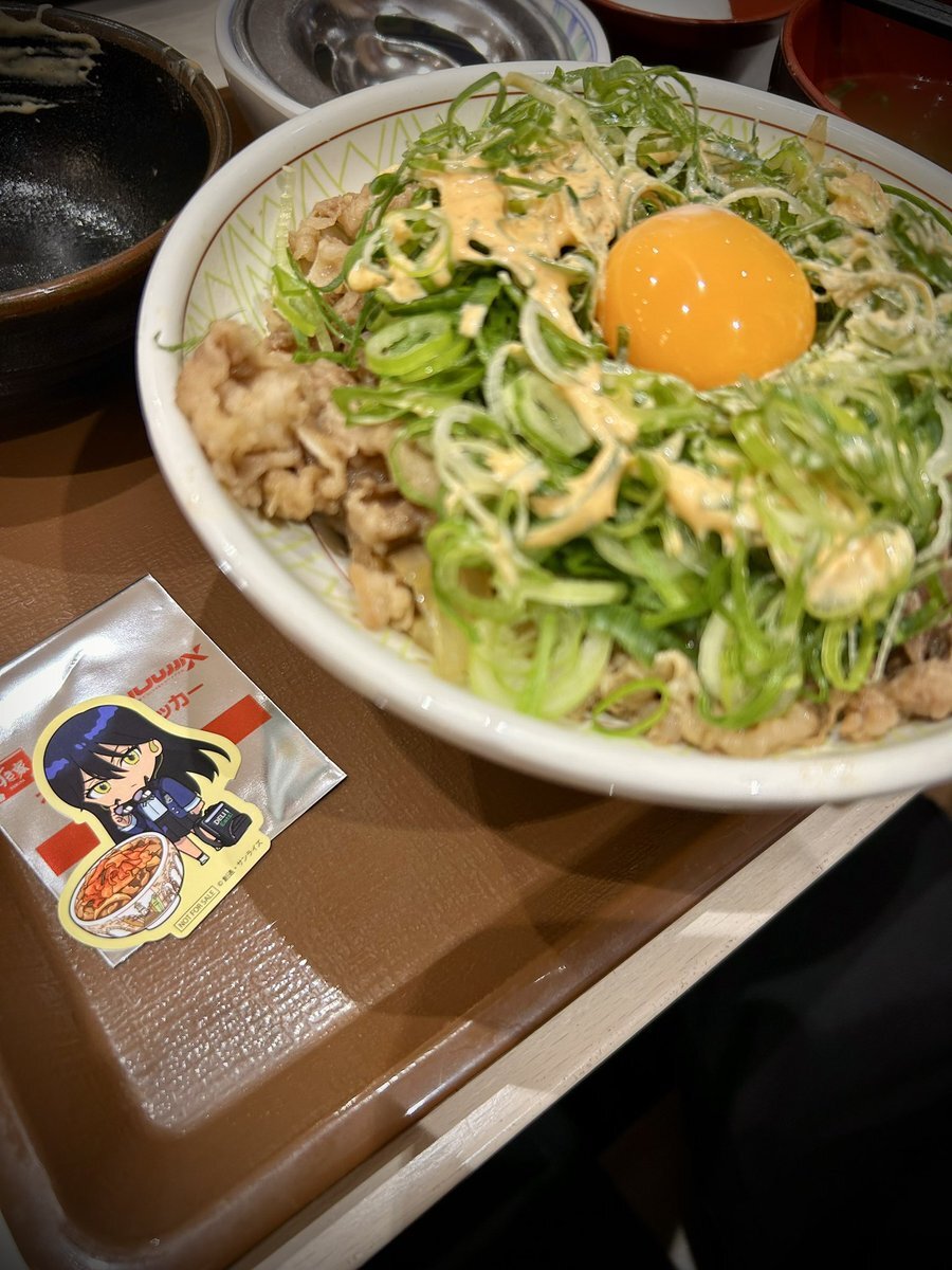 すき家×ジークアクス 二日目 今日は 牛丼(生卵)+ ねぎ×明太マヨ!! ピリッと辛くて美味しかった〜!😆 卵もマイルドになって良き! ステッカーはシュウちゃん!! 今度は何にしようかな〜( ^∀^) #すき家 #ガンダムジークアクス #このひとときキラキラ pic.x.com/oWdvbuNYhb