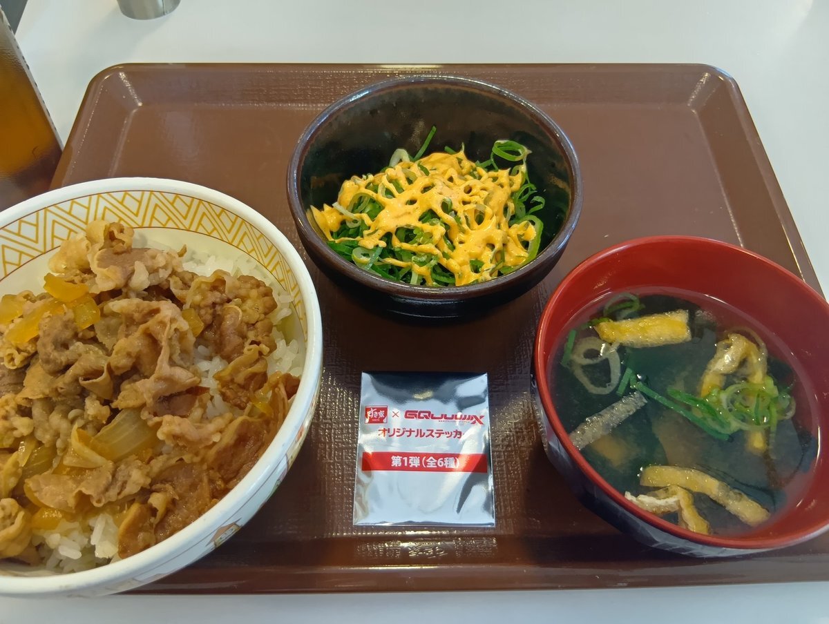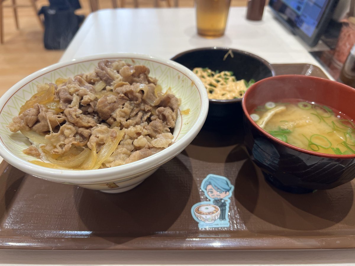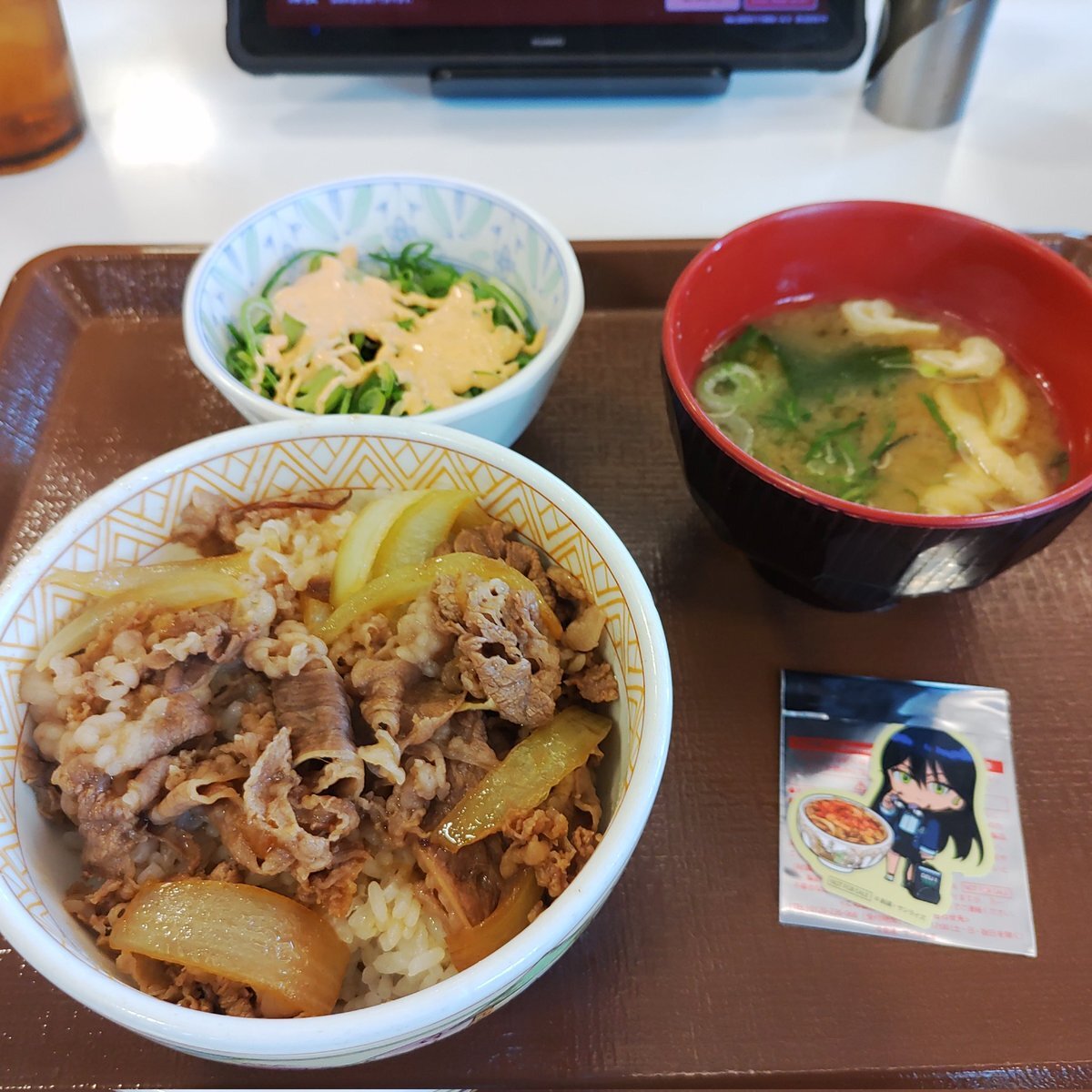すき家×ジークアクス 二日目 今日は 牛丼(生卵)+ ねぎ×明太マヨ!! ピリッと辛くて美味しかった〜!😆 卵もマイルドになって良き! ステッカーはシュウちゃん!! 今度は何にしようかな〜( ^∀^) #すき家 #ガンダムジークアクス #このひとときキラキラ pic.x.com/oWdvbuNYhb