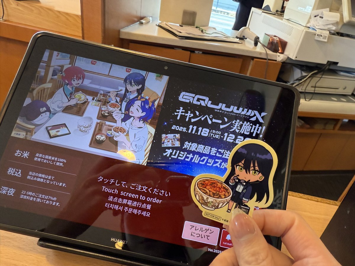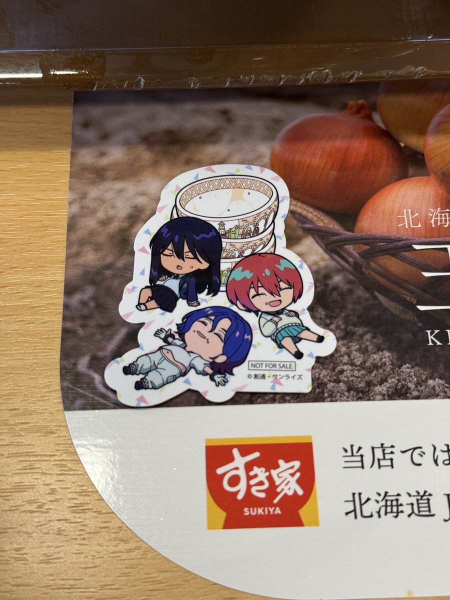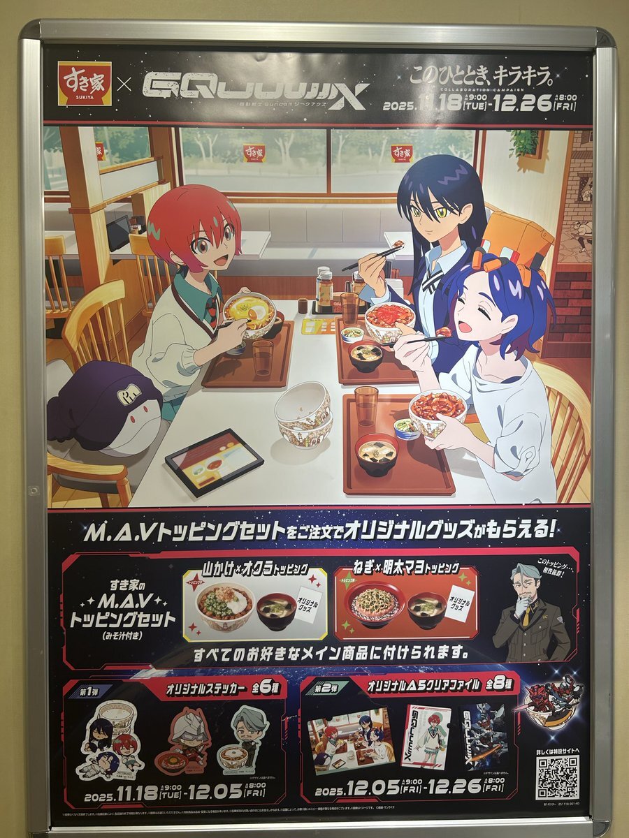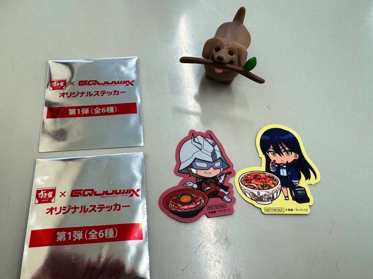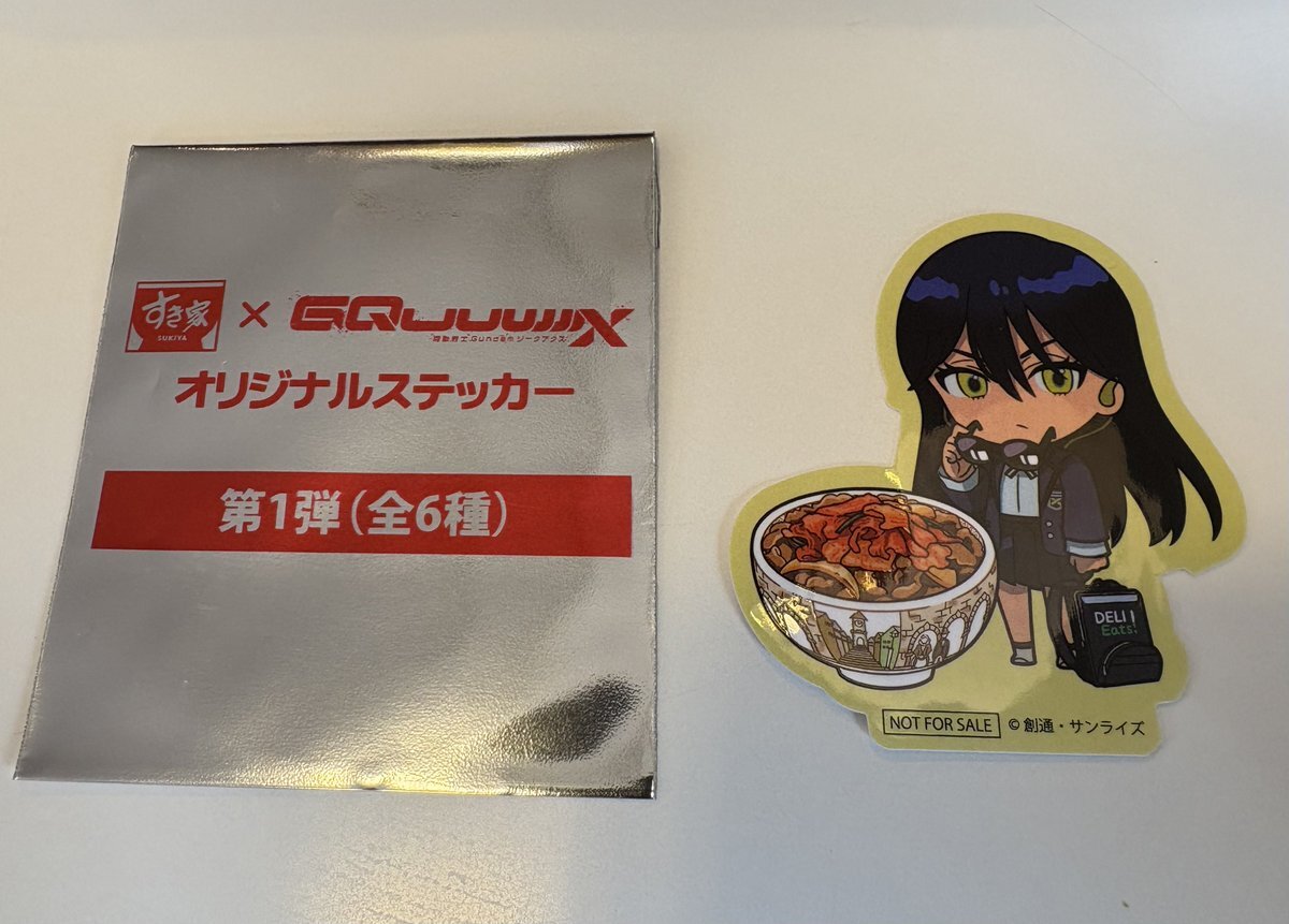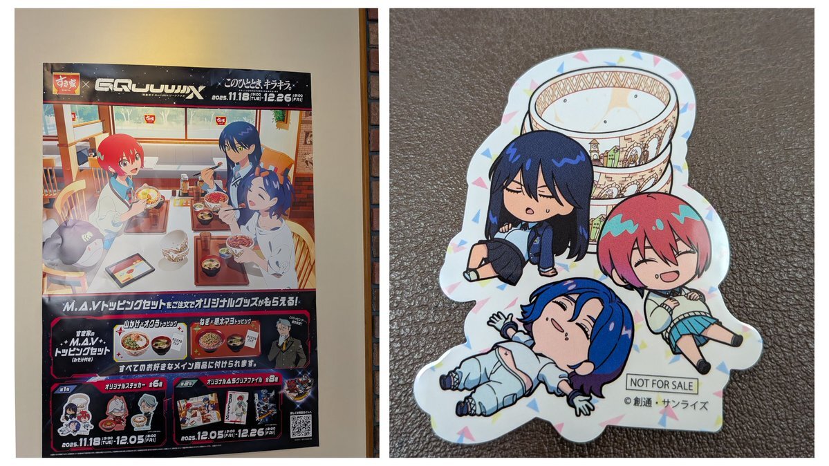 すき家×GQuuuuuuX 指定トッピングと牛丼を頼めば限定ステッカーGET! 最安はお子さま牛丼と明太子でもOK カレーもOKだけど定食は組み合わせ不可 ニャアンとらいとちゃんと、すき家 #このひとときキラキラ pic.x.com/qBgi79EN42