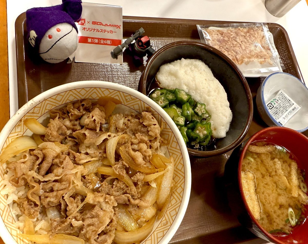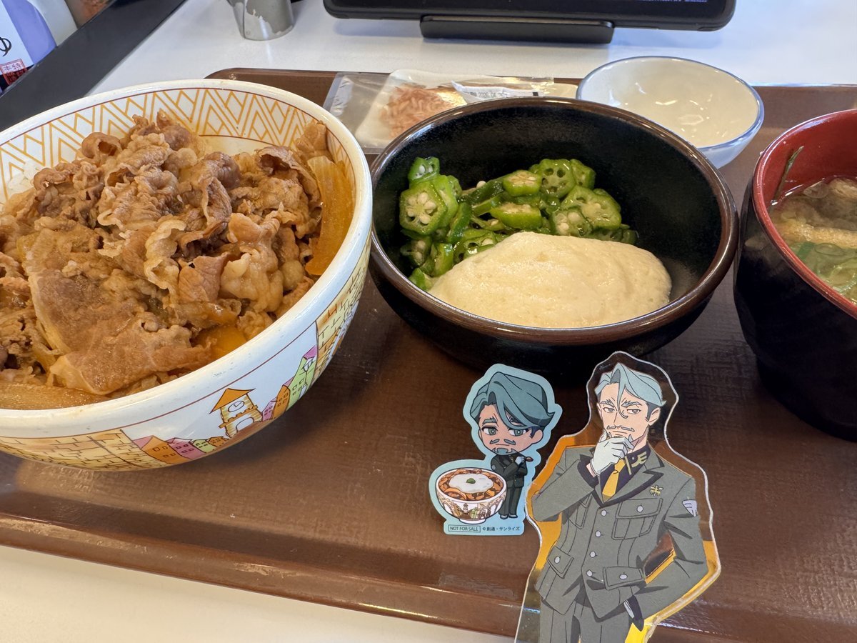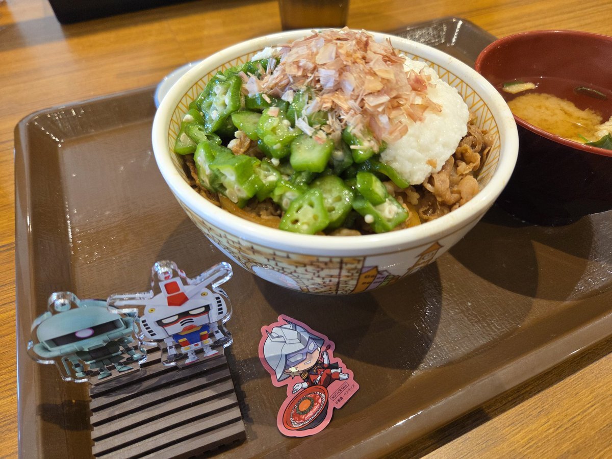 すき家ジークアクスコラボ、いつも頼む山かけオクラでありがたい(*´ω`*) ステッカーは緑のおじさん オクラだけ牛丼に分けて、わさび全部醤油でといたら山かけによく混ぜる! わさびの辛味が山かけで中和されて香りと風味が残って美味しい! 鰹節も山かけに混ぜて風味良し! #このひとときキラキラ pic.x.com/w63y26kzPJ