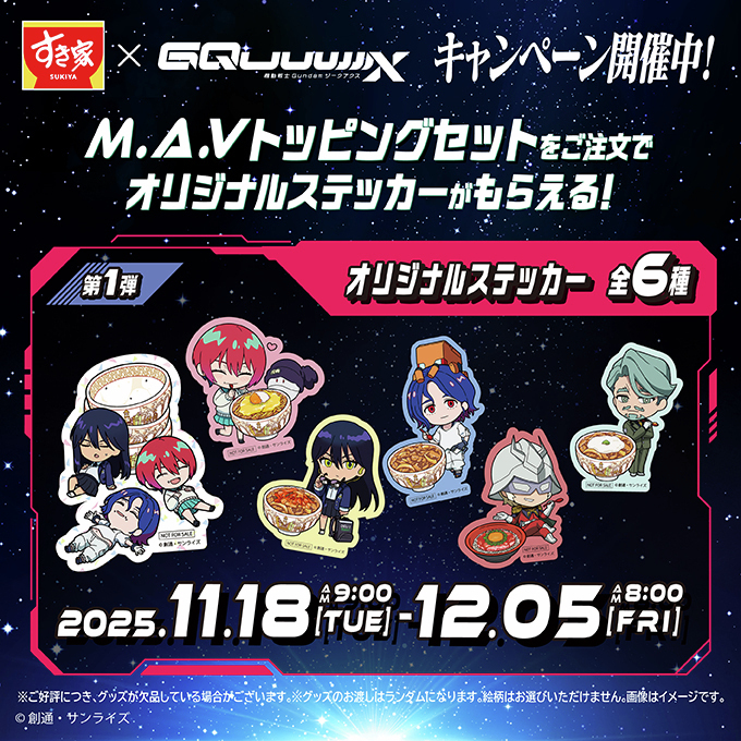 / / #すき家 × #ガンダムジークアクス \ \ 🎊本日より、コラボスタート🎊 第1弾は、オリジナルステッカー全6種! 「M.A.Vトッピングセット」をご注文でもれなくプレゼント✨ 店内放送も、ぜひお楽しみください‼😆 詳細はこちら👉bit.ly/42Sw0wi #このひとときキラキラ