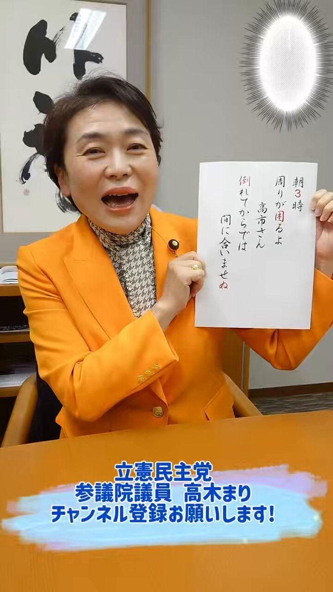 〜朝3時  周りが困るよ    高市さん  倒れてからでは     間に合いませぬ〜 youtube.com/shorts/hZlcq47… YouTubeチャンネルの登録もお願いします! #立憲民主党 #参議院議員 #埼玉県 #この国をその先へ #動けば変わる #高木まり