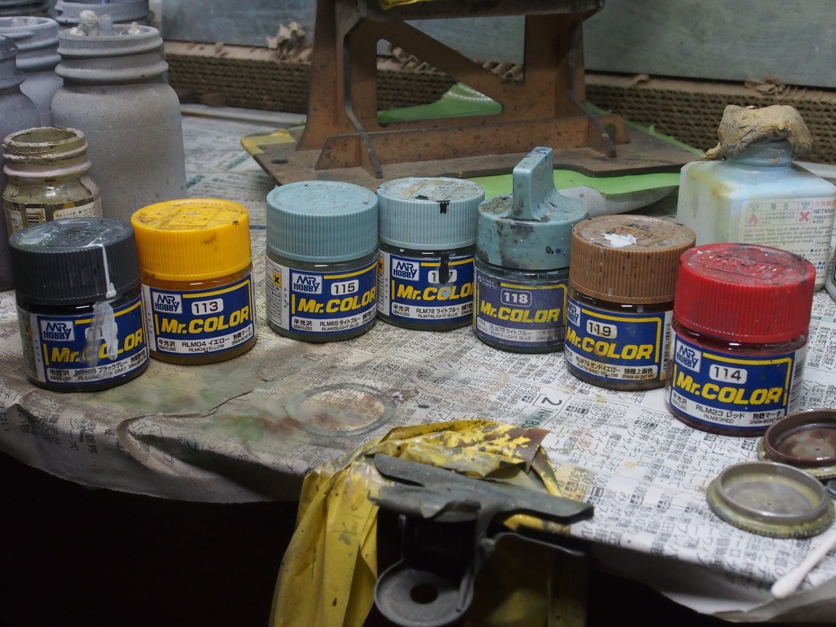 #この塗料使ってます クレオスMr.カラーのドイツ空軍機特色110番台。 Mr.カラーだとドイツ機カラーがほぼ揃っているので助かります。ライトブルーだけで三色あるのです。 クレオスでも水性だと欠けが多いし、タミヤカラーだとスプレーしか出てない色とかあるので、Mr.カラー以外の選択肢がありません。 pic.x.com/RdgI386LQB
