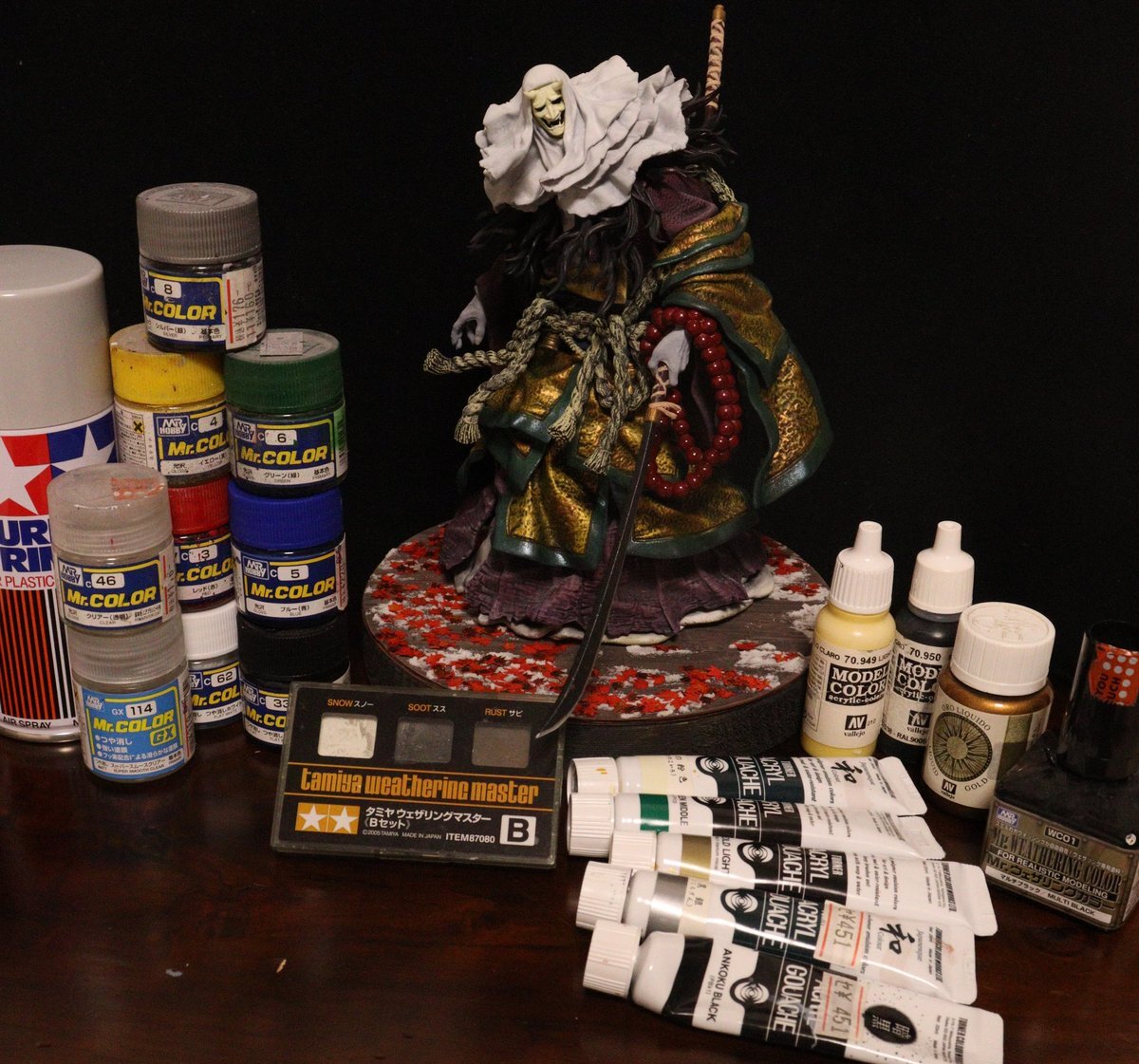 #この塗料使ってます 「破戒僧」を塗装した時のものを振り返ってみました。下地から完成まで使ったものです。 大まかにラッカーで、細部の質感の微細な部分はファレホやアクリルガッシュで…というのが定番の手法です。 あとは根気と調色がものを言うのかな…と思いました。 pic.x.com/WJ9324OWfj