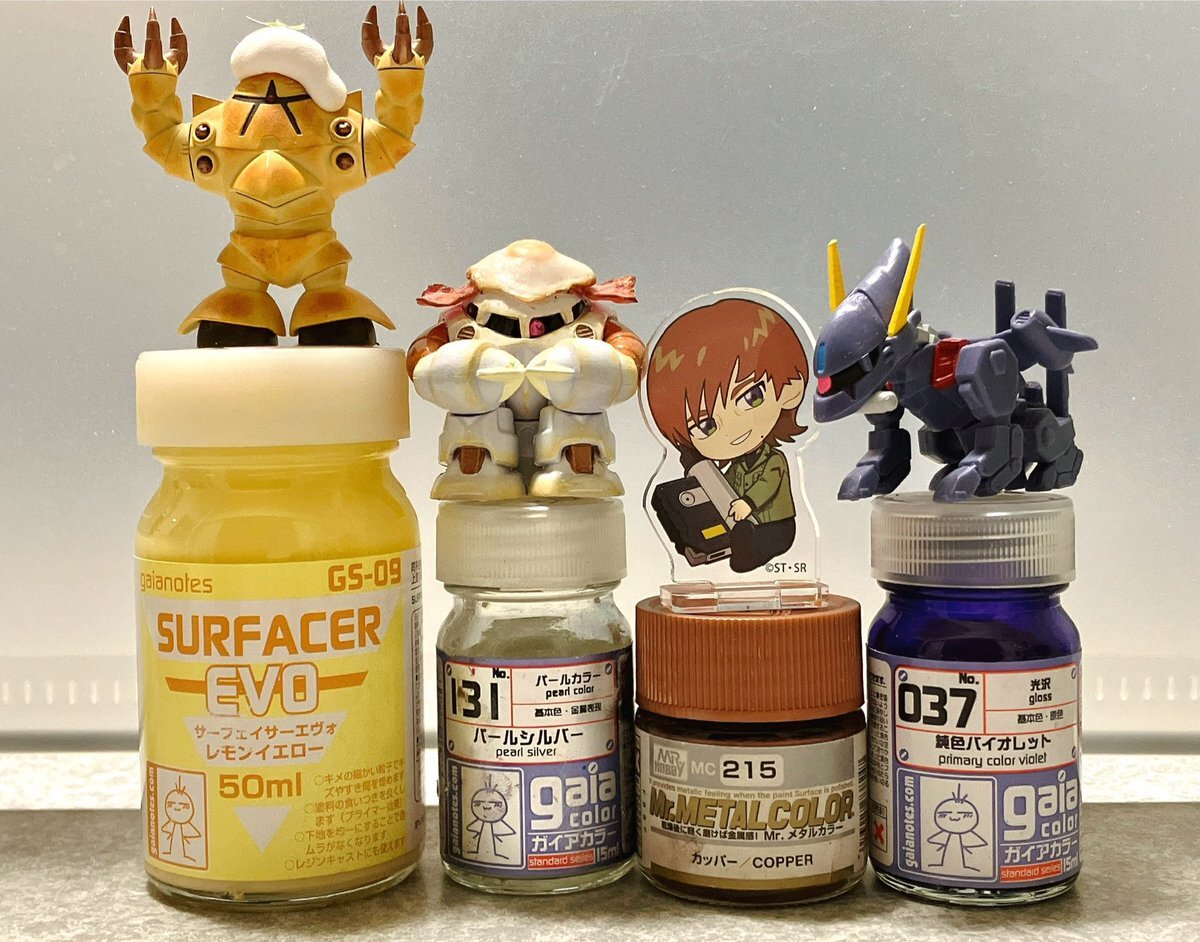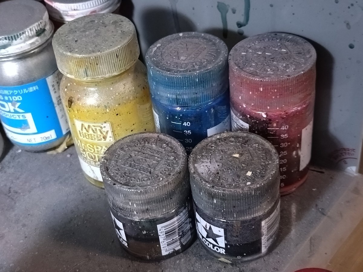 #この塗料使ってます 全ての塗装をエアブラシで済ませているのでハンドピースに残った塗料はこんなふうに分けています。 楽です。 (混色メタリックの蓋が開きません、開く日までツイート控えます) ラッカーも水性も関係なく交ぜてます、そして色んな色の混ざった濃いグレーが個人的には推し色です。 pic.x.com/Ts1ScCWkld