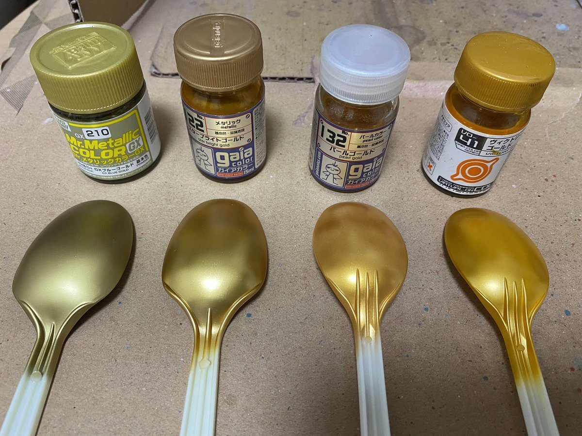 #この塗料使ってます 今でもよく使うのはスターブライトゴールド☺️ このスプーン達を再度見て好きと感じるのはやっぱりヴィクトリーゴールド。 でも配色を考える時にどの金が合うかなってやっぱりその都度考えるのでどの金も持ってると便利😆 x.com/cool_wizard/st…