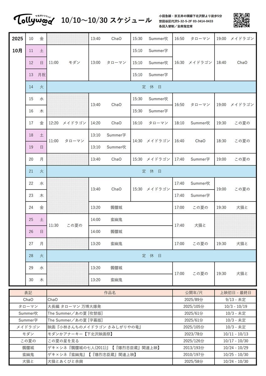 2025/10/10(金)~10/30(木)のスケジュールです! #映画ChaO #TheSummerあの夏 #映画タローマン #映画メイドラゴン #モダンかアナーキー #この夏の星を見る #ゲキシネ #犬猫とあくびと余興 ※10/9時点 tollywood.jp pic.x.com/TDc8JrdU3T