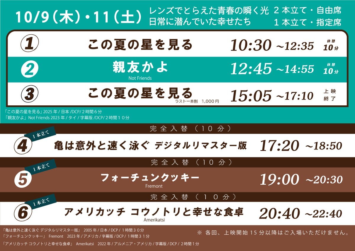 【🔭初日です🎥】 📅10/9㊍ 『#この夏の星を見る』 『#親友かよ』 🎦2本立て・自由席 ⚠チケット販売開始は①のみ開場時間から、 ②③は前の回上映15分後 『#フォーチュンクッキー』 『#亀は意外と速く泳ぐ デジタルリマスター版』 『#アメリカッチ コウノトリと幸せな食卓』 🎦1本立て・指定席 pic.x.com/dE0dhMpeQ5