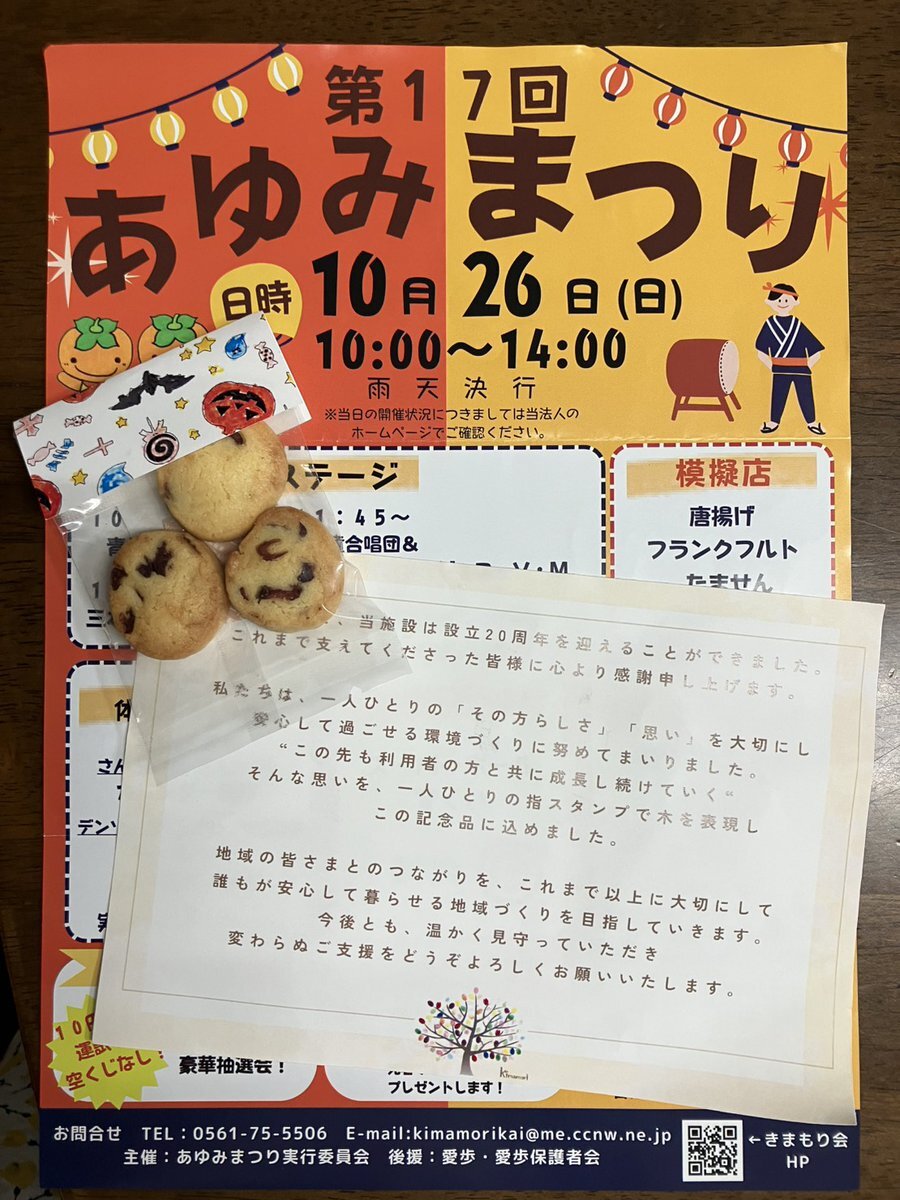 日進市の障害福祉を支え続けてきた #きまもり会 創立20周年おめでとうございます。今日は施設敷地内であゆみまつり。太鼓、ダンス、いろんな模擬店楽しませてもらいました。 知り合いの利用者家族も「パン販売がんばったよ」と笑顔。パンは完売、クッキーを買いました。 #ごとうみき #日進市議 pic.x.com/3LVYI2LlXS