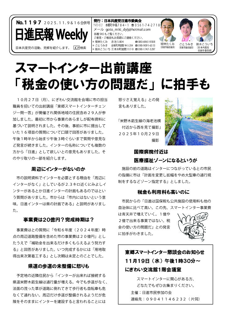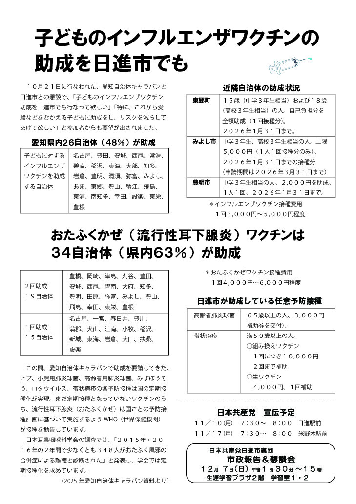 日進民報weekly№1197裏面。 #インフルエンザ はやっています。 同時に、今大学入試(推薦)が毎週のように実施されている時期。先日の医療福祉の充実を求める自治体キャラバンと日進市との懇談でも、ワクチンの助成を求める意見がだされました。希望する人が接種できやすくるす制度へ!#ごとうみき pic.x.com/3IEnGDB8XQ