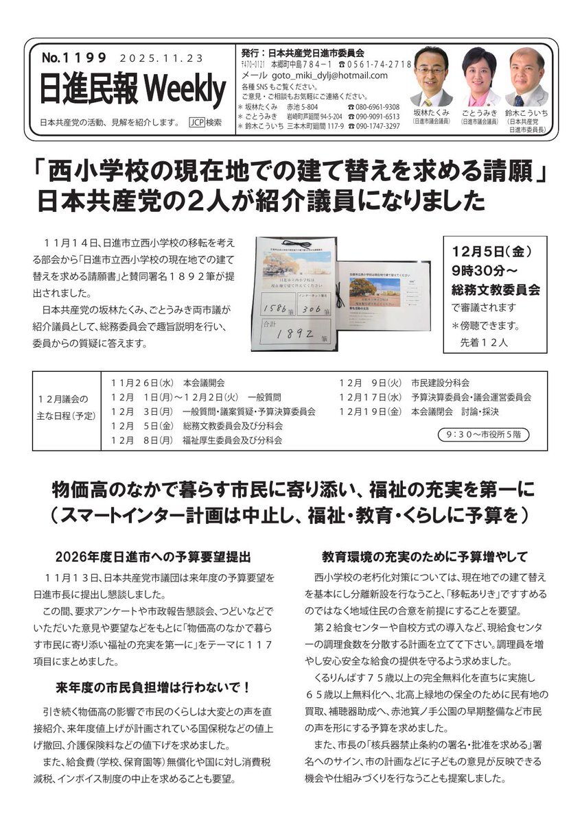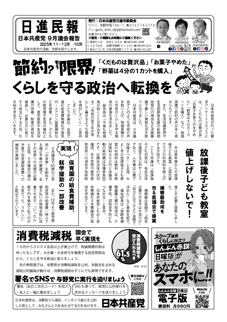 \日進市のみなさん/ 日進民報9月議会報告が発行されました! 9月議会ではこんなことが実現✨️ ▶保育園給食への補助 ▶就学支援世帯の給食費一時立て替え払いが現物支給に改定(10月より) ぜひお読みください🙇♀️ #日本共産党 #日進市 #ごとうみき #坂林たくみ #鈴木こういち x.com/DyljGoto/statu…
