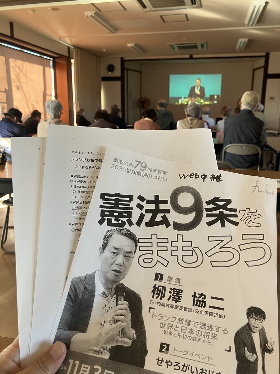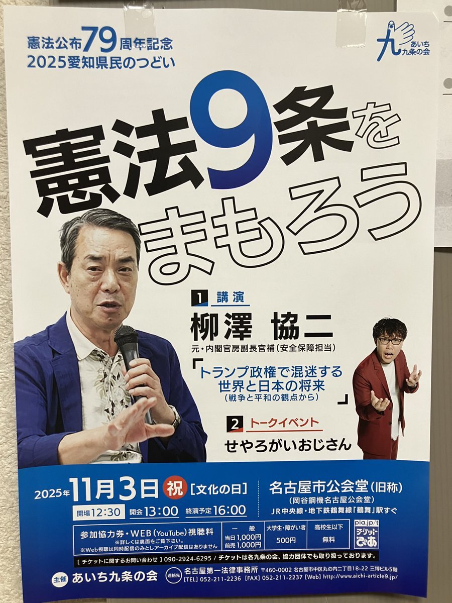 本日 #文化の日 憲法公布79周年記念 2025愛知県民のつどい #憲法9条をまもろう #柳澤協二 氏の講演、#せやろがいおじさん トークイベントも。 日進九条の会が「web視聴会場」を開いてくれます。 日進市役所隣、にぎわい交流館1階会議室にて。 11/3、13:30~私も参加します #ごとうみき pic.x.com/eg4GXAPNpr