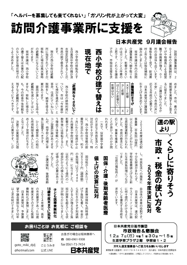 日進民報9月議会報告(裏面) #道の駅 に30億円かけるより、介護事業所や学校施設の老朽化対策への予算が必要!住民の福祉向上が自治体の役割です。 国保・介護・後期高齢者医療の値上げには反対。保険料の年金天引きができず別途納入する人が増えているなど重い負担に。#ごとうみき #日進市議 pic.x.com/FdQU6EOzCS
