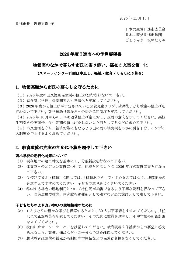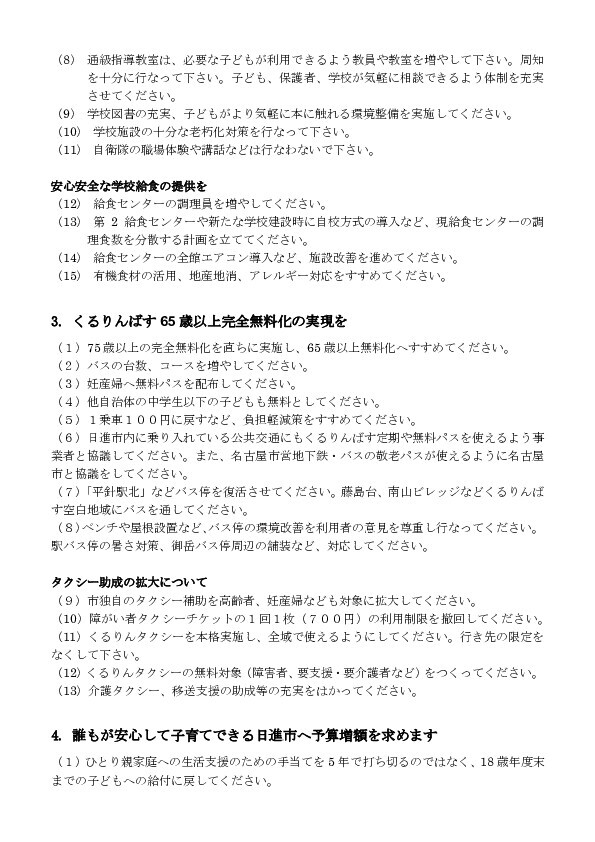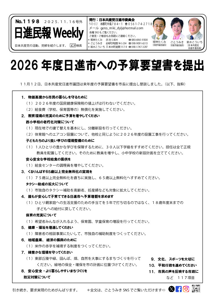 9月議会報告号(表) 日進市内でみなさんから頂いた要求アンケートをもとに、暮らしの実態を伝え、利用料等値上げしないで、と論戦した議会でした。 #就学援助 の一部改善、保育園給食の補助など10月より実現したこともあります。 #補聴器助成 も提案! #ごとうみき #日進市議 #日本共産党