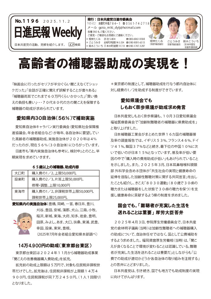 \日進市のみなさん/ 日進民報Weekly発行されました📜 日進市でも加齢性難聴者の補聴器購入助成をと求めました。 県議会議でもしもおく県議が求めました。 高額な補聴器購入にあたって自治体からの助成が求められています。 引き続き求めていきたいと思います! #日進市 #ごとうみき #補聴器購入助成 x.com/DyljGoto/statu…