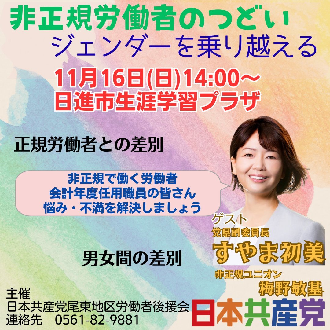 非正規労働者のつどい・ジェンダーを乗り越える #すやま初美(党県副委員長)と一緒に話しませんか。 日時:11月16日(日)14時~ 場所:日進市生涯学習プラザ(日進市浅田町西前田8-7) 参加費無料。途中参加OK。 主催:日本共産党尾東地区労働者後援会 私も参加します #ごとうみき #日本共産党 pic.x.com/J1GoZkGLhX