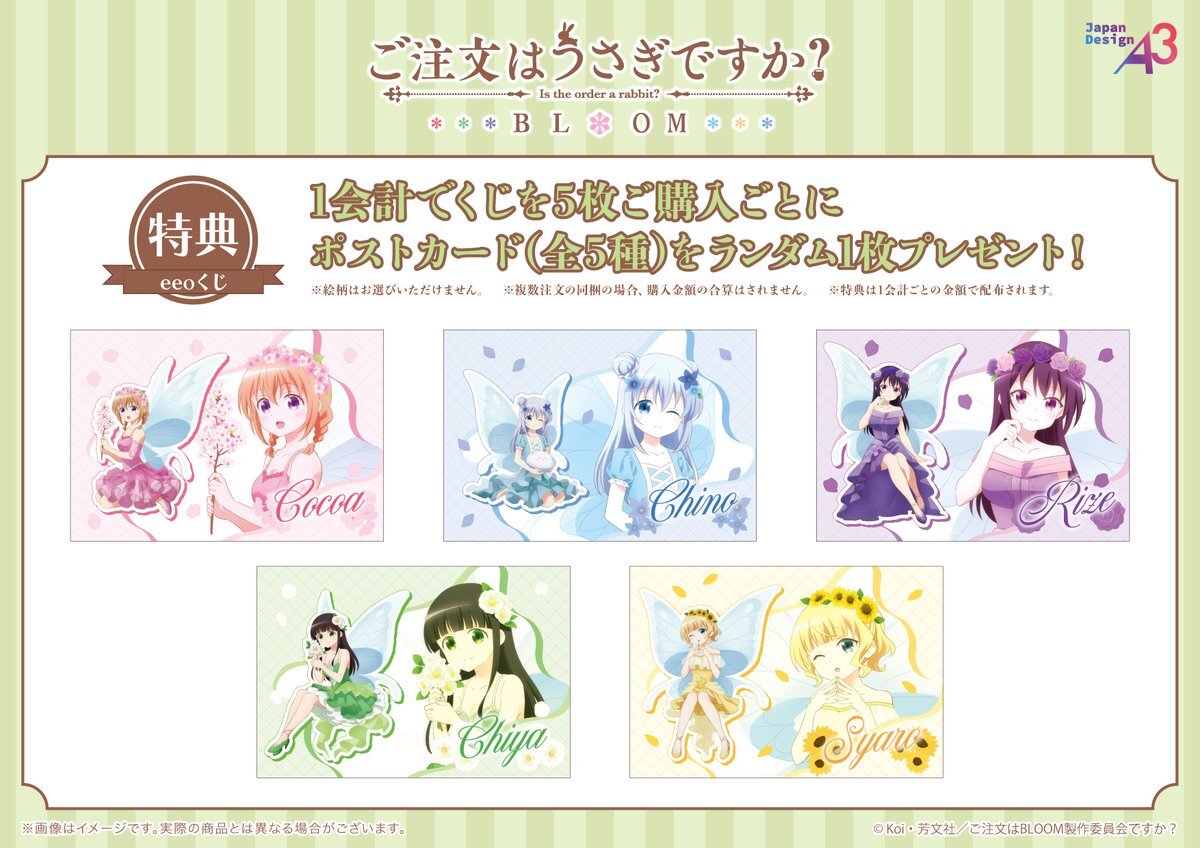 🌷特典情報🌷 『#ご注文はうさぎですか?BLOOM』eeoくじを 1会計で5枚お買い上げごとに ポストカード(全5種)をランダムで1枚プレゼント! 全種コンプリートしたくなる可愛さです…🤍 ぜひお見逃しなく💫 #gochiusa pic.x.com/fgNrQiPlmX