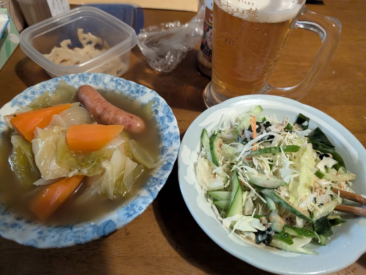 晩酌タイム🐷🍻 ポトフのスープとサラダ🥗いただきます🙇😋 今日も寒かったね🤧 ありがとうございます🙇🍻 #ご飯ととるのがいいと聞きました #いただきみんな pic.x.com/5aL0MlcA9H