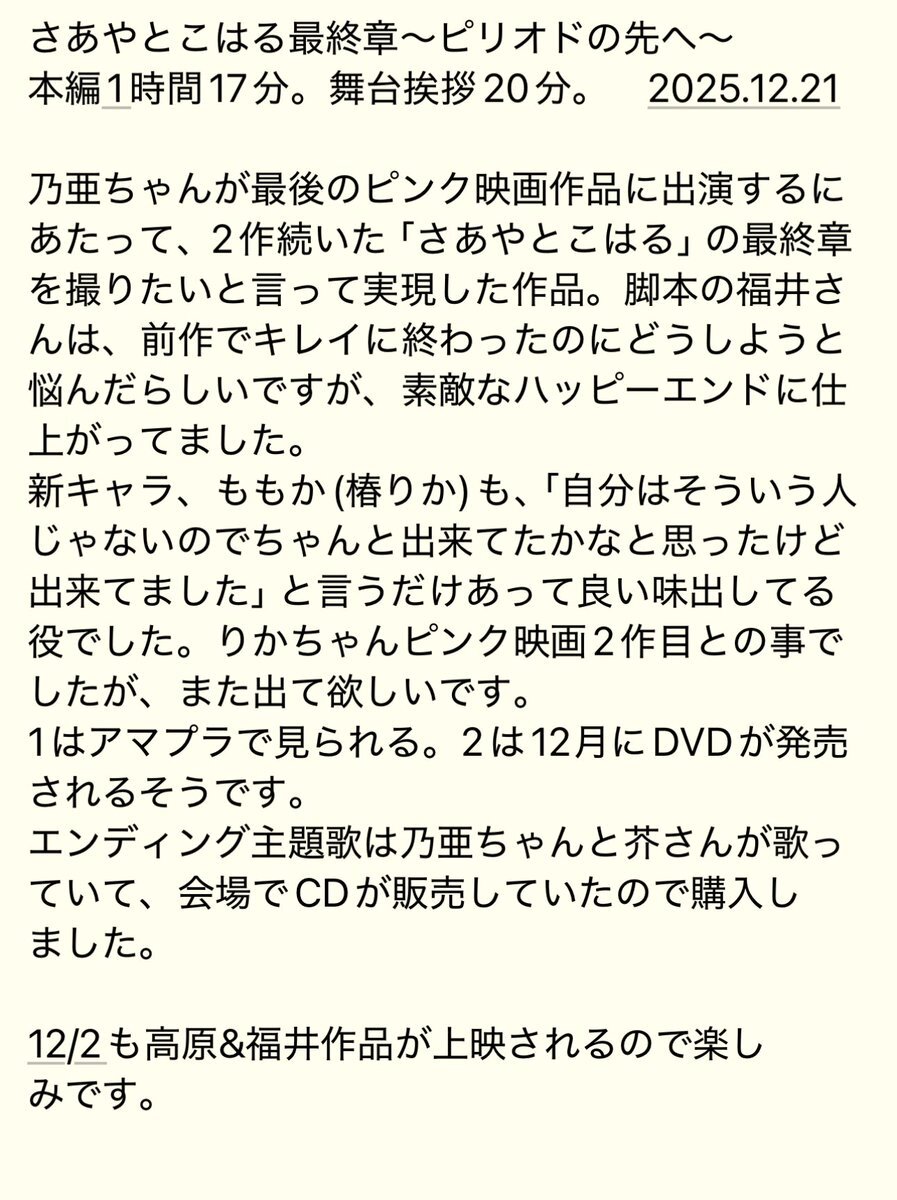 明日は『さあやとこはる最終章』を観にいこ。 うん。 OPフェス2025@テアトル新宿 『さあやとこはる 最終章 ~ピリオドの先へ~』 11月28日(金)20:50 #さあやとこはる最終章 栄川乃亜 燃ゆる芥 椿りか 東野良平 村松恭子 森川凜子 モリマサ 脚本・漫画 福井遥香 音楽 おおくぼけい 撮影 pic.x.com/VkkDjmIjoy