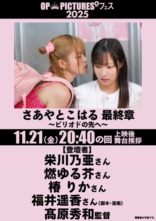 🎊本日開幕🎊 ◤OP PICTURES+フェス2025◢ @テアトル新宿 《11/21(金)~12/2(木) 2週間限定上映》 オープニング作品は 『さあやとこはる 最終章 〜ピリオドの先へ〜』 上映後、舞台挨拶開催! 充実ラインナップのグッズもぜひ✨ ▼チケットご予約▼ ttcg.jp/theatre_shinju… #OPフェス