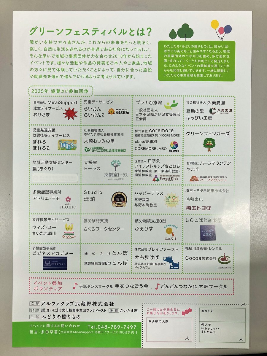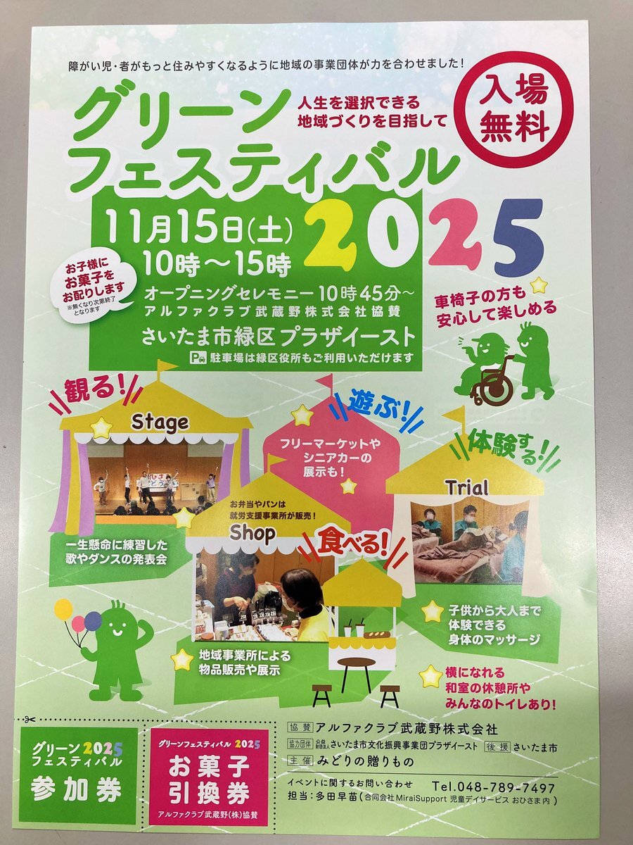 グリーンフェスティバル2025を今年も開催! 2025年11月15日(土) さいたま市緑区中尾1440-8 プラザイースト どなたでも入場が無料! #グリーンフェスティバル #放課後等デイサービス #おひさま #さいたま市緑区 #さいたま市見沼区 #児童指導員 #募集中 pic.x.com/dcqKZb4DpZ