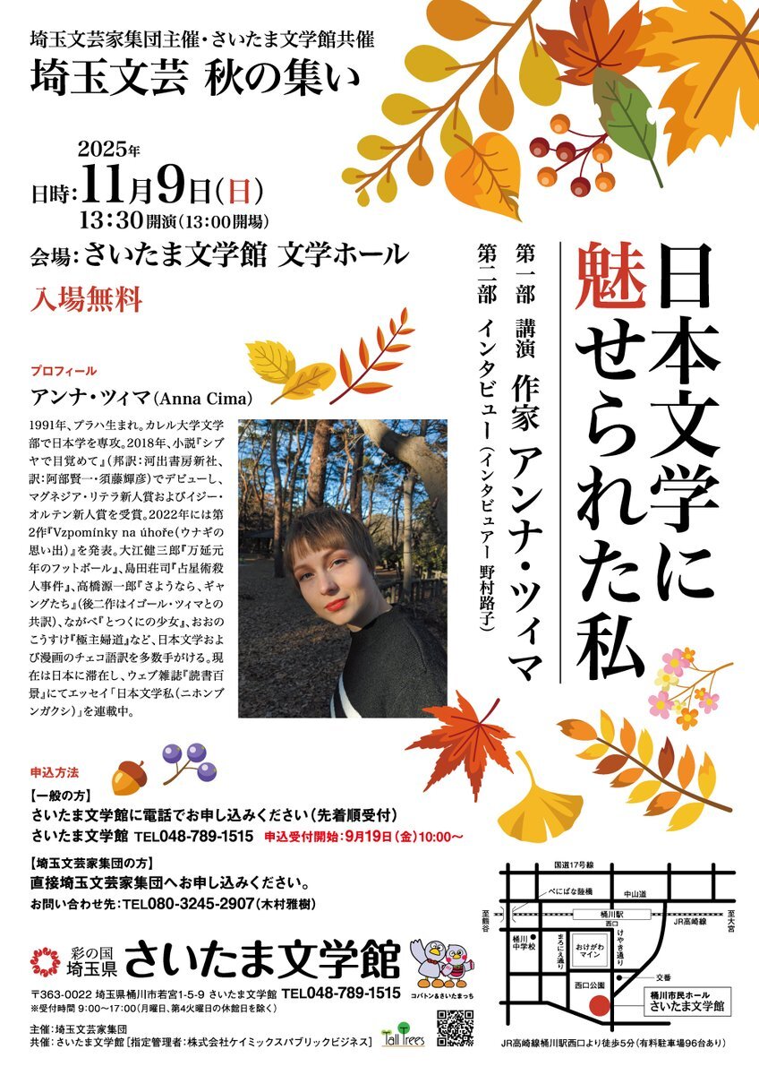 10月15日(水)夜カフェ文学タイム 11月9日(日)埼玉文芸 秋の集い お申込み開始になりました! 文学の秋を感じてみませんか? 皆様からのお申込みお待ちしております🎵 #さいたま文学館 #夜カフェ文学タイム #前尾津也子 #秋の集い #アンナ・ツィマ pic.x.com/2aLOXCcq9Z