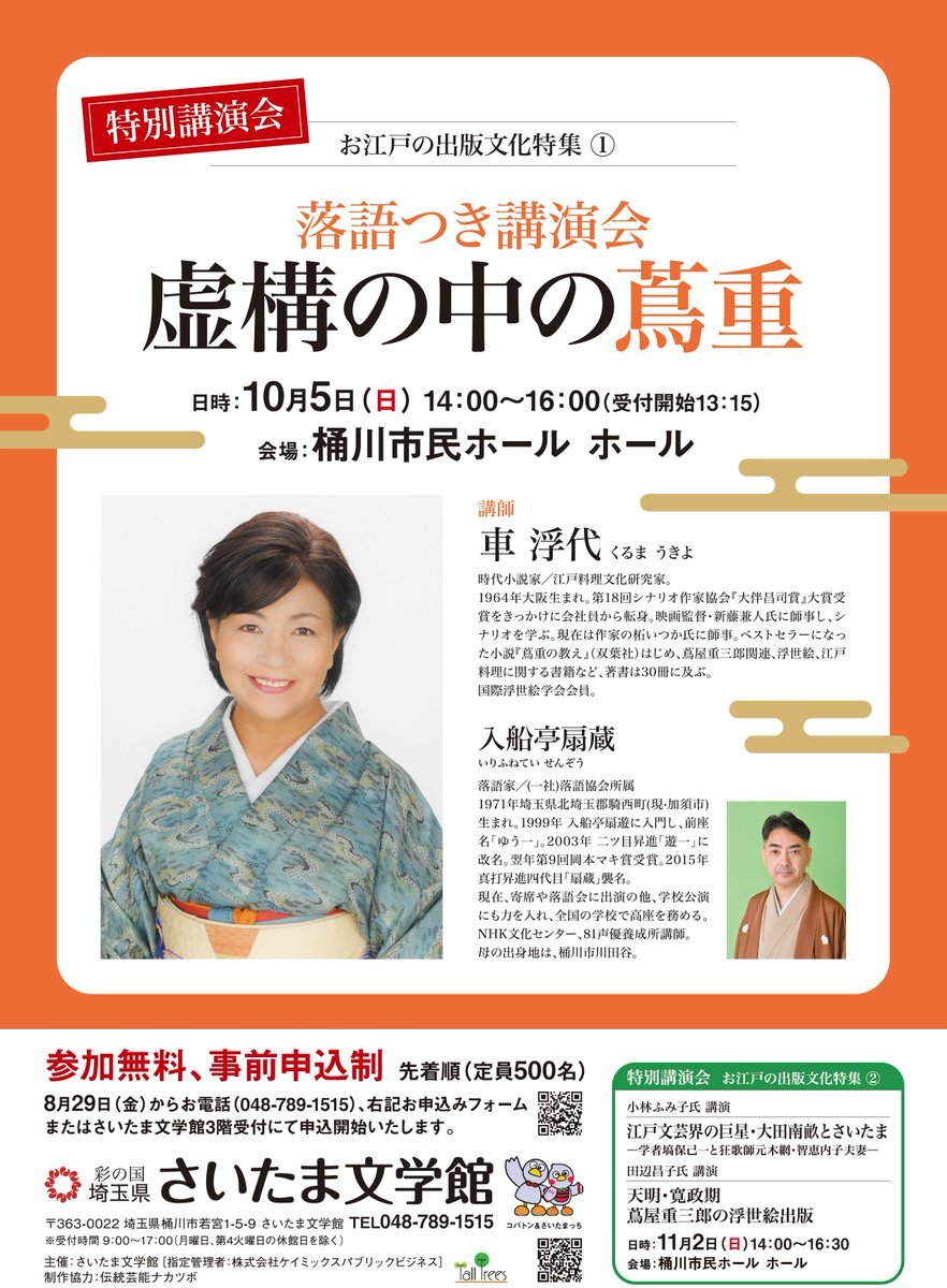 本日はこちら、#桶川市民ホール の大ホールで、 #さいたま文学館 主催の講演会です。 題して「落語つき講演会 虚構の中の蔦屋」。 落語は #入船亭扇蔵 師匠が務められます。 14:00から16:00、入場無料。当日参加も可能とのことですので、お近くの方は是非。 pic.x.com/2j6RFL8egS