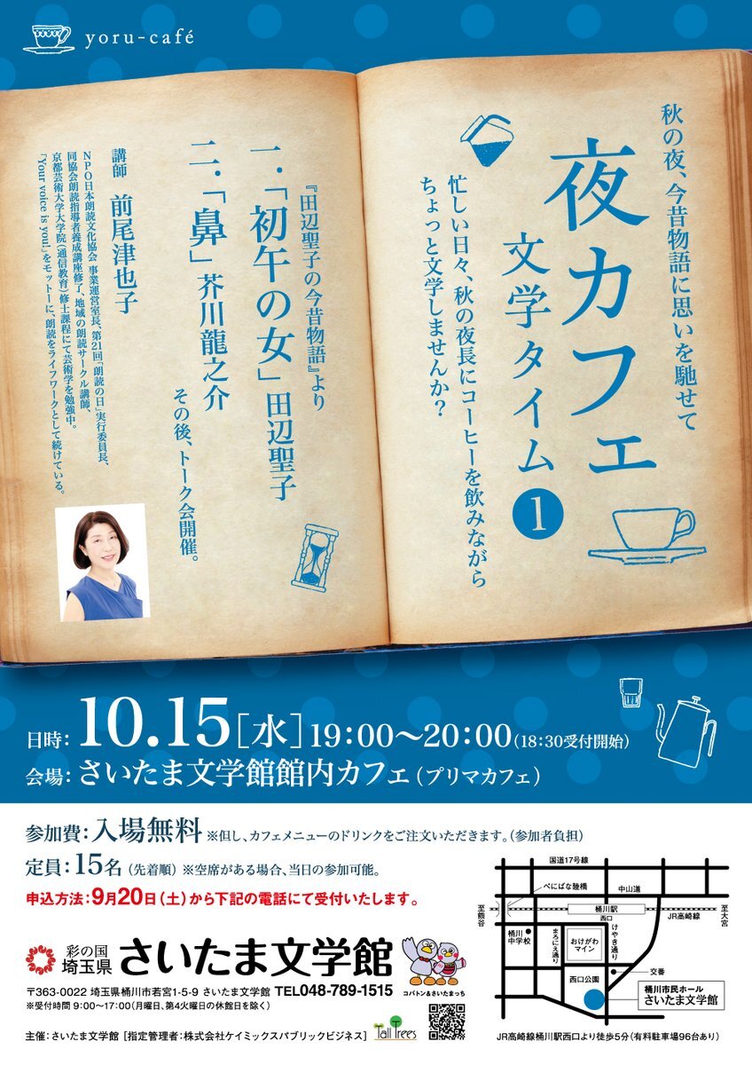 【朗読者派遣】 さいたま文学館で10月15日(水)に開催される 「夜カフェ 文学タイム」に、会員の前尾津也子さんが出演します。 テーマは「今昔物語」! ぜひお出かけください📷#朗読 #さいたま文学館 pic.x.com/29Qcd1NJhH