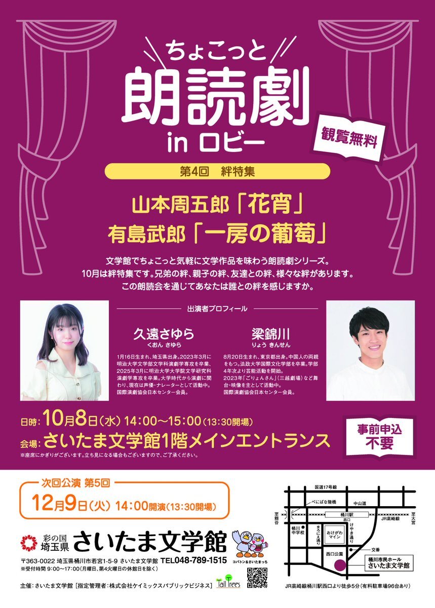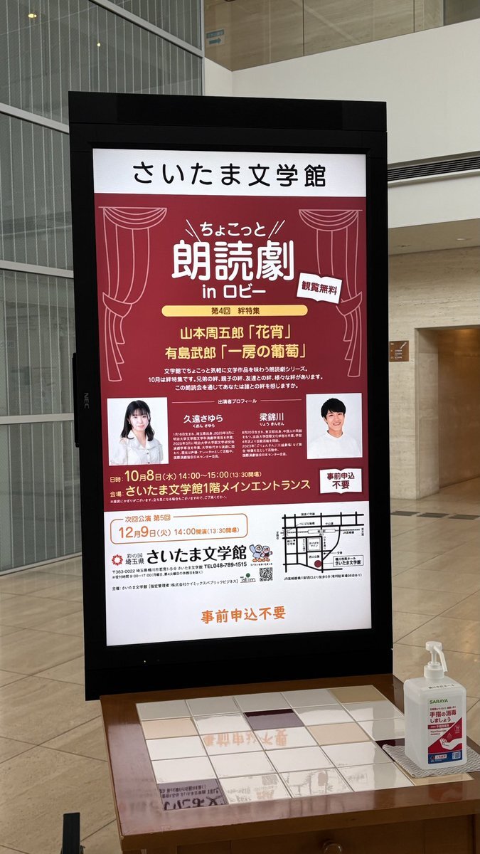 『ちょこっと朗読劇』、終演いたしました❣️御来場いただいた皆様本当にありがとうございました🥰 山本周五郎『花宵』、有島武郎『一房の葡萄』を読ませていただきました🍇 次回のちょこっと朗読劇は12月だそうです😳 皆様是非第5回も足をお運びください✨️ #さいたま文学館 #久遠さゆら #梁錦川 pic.x.com/iGHbluTTQA