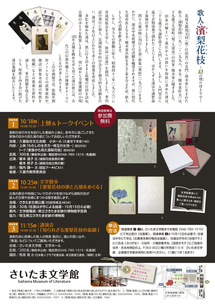 【濱梨花枝企画展関連事業のお知らせ】 10/11(土)から始まる企画展関連事業の申し込み受付中です! 10/18(土)は久喜総合文化会館小ホールにて上映&トークイベントを行います。家族の目から見た花梨花枝の姿についてのお話が聞ける貴重な機会です。 #さいたま文学館 #濱梨花枝 #短歌 pic.x.com/EKI1nmufZ1