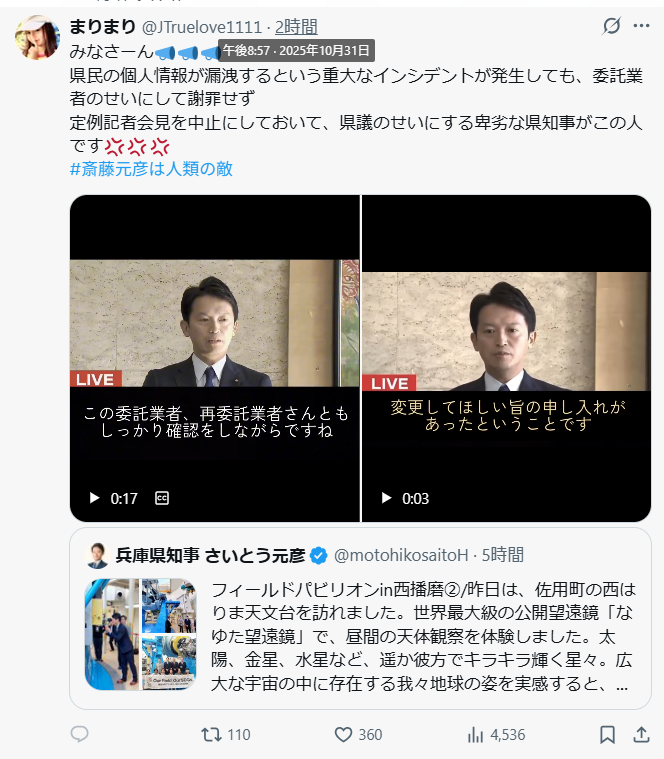 斎藤知事をおとしめるネタであれば、身体を動かすクセまでも、動画にアップする卑劣な行為は止めるべきだ。 反斎藤知事派の方々の中に、品格も人間性も欠落したかのように、知事をイジメることによろこびを覚え、究極のサド的投稿を続けている方がいるのが嘆かわしい。 それでも、知事は負けない。 x.com/9DMNAjvfqy2948…