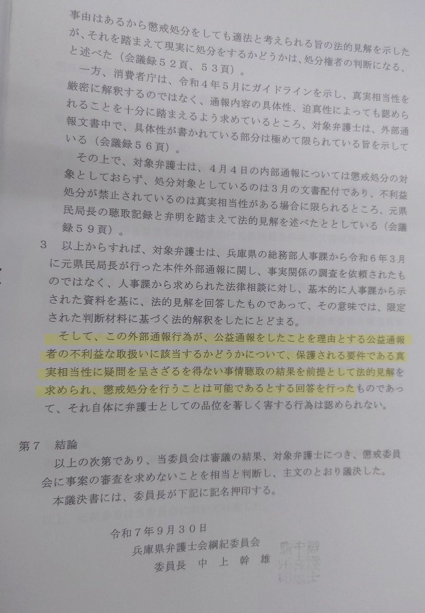 朗報です 兵庫県側の弁護士に対する懲戒処分請求が 却下されたようです。 つまり、県側の弁護士の行動は弁護士として問題ではないと判断されたわけです。 この内容からして言える事は 県側の主張である 『通報者が保護される要件である真実相当性に疑問を呈さざるを得ない』