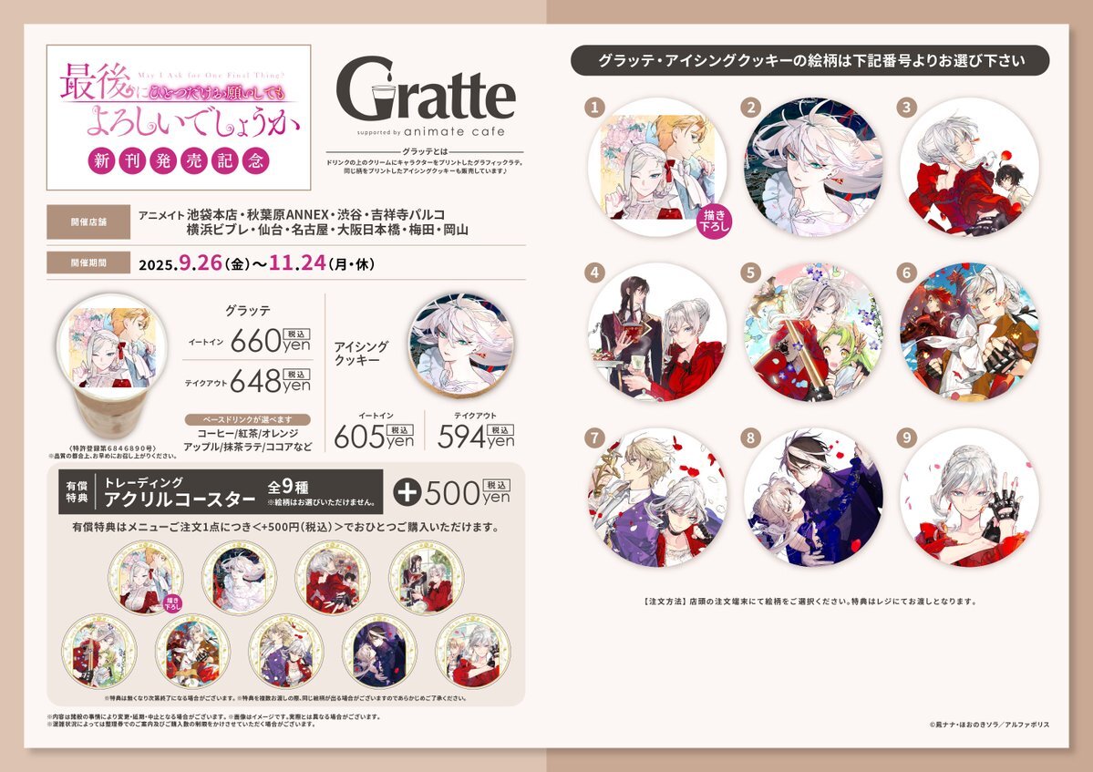【#グラッテ 担当より】 只今『「最後にひとつだけお願いしてもよろしいでしょうか」新刊発売記念グラッテ』コラボ中🎉 お絵柄は全9種類🍪☕ ご注文1点毎に有償特典アクリルコースターをランダムで1枚ご購入いただけます❤ 開催記念グッズも販売中❕ ぜひお見逃しなく👀🌟 #さいひと pic.x.com/Gmpq626ePu