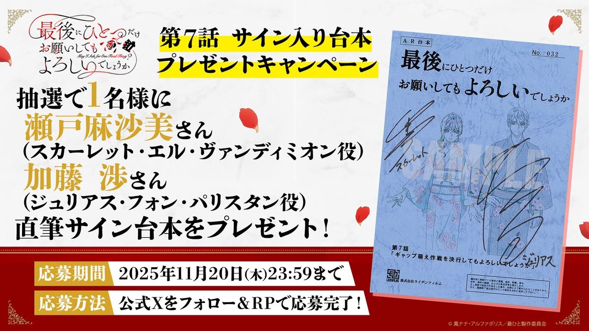 ━━━━━━━━━━━ 📚サイン台本🖊 プレゼントキャンペーン ━━━━━━━━━━━ ▌第7話 スカーレット役 #瀬戸麻沙美 さん ジュリアス役 #加藤渉 さん のサイン台本が1⃣名に当たる🎁✨ 🌹𝟐𝟎𝟐𝟓.𝟏𝟏.𝟏𝟒 𝟐𝟒:𝟎𝟎 | 𝐎𝐍 𝐀𝐈𝐑 saihito-anime.com #さいひと