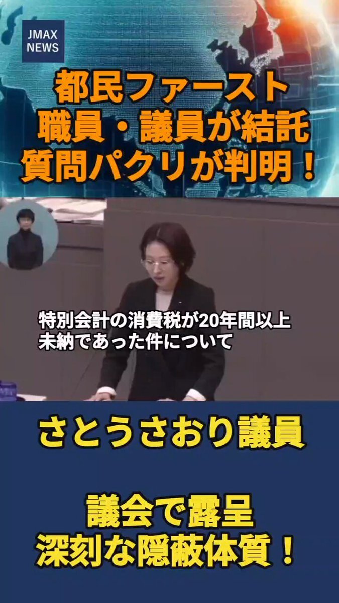 さとうさおり議員、キレッキレです!何故か?前に発言した都民ファーストの議員がさとう議員の質問をパクった為に「やってんな」と即座に判断!議会当日一時退席し、本来の質問予定の内容を書き換えて挑んでいるのだ!なので後半のこの質問は熱量が半端ない!カッコ良すぎ! x.com/JmaxTopics/sta…