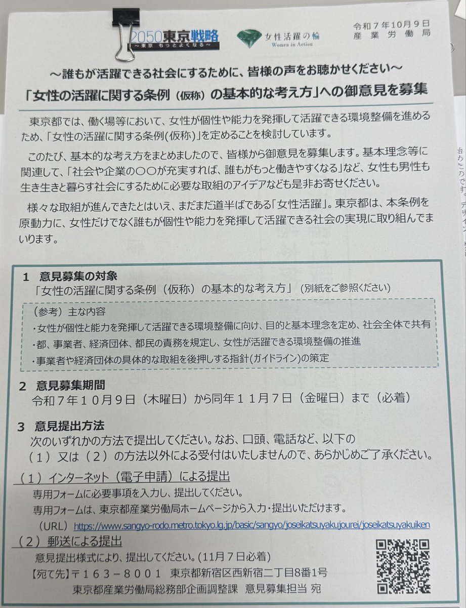 【期間:10月9日-11月7日】 東京都の新設条例 女性の活躍に関する条例(仮)に対する 都民のご意見募集が始まりました! リンク先から提出ができるので ぜひ、皆様の想いを書き込んでみて下さい 皆様の声で、東京都の条例が決まります sangyo-rodo.metro.tokyo.lg.jp/basic/sangyo/j… x.com/satosaori46/st…