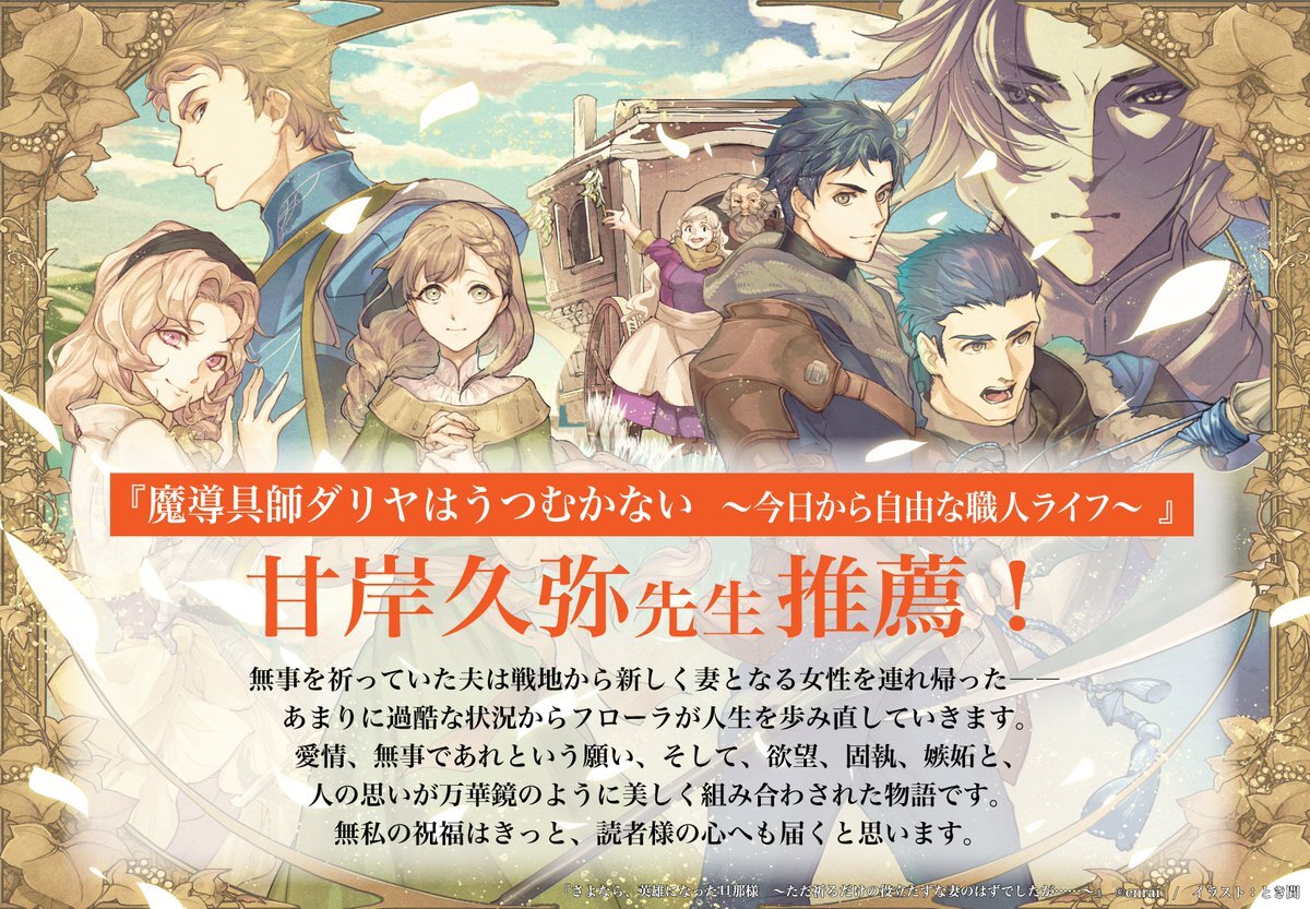 #さよなら英雄になった旦那様 『魔導具師ダリヤはうつむかない 〜今日から自由な職人ライフ〜』の著者・甘岸久弥先生(@amagishihisaya)より素敵な推薦文をいただきました✨ 優しさと温かさで溢れる"祈り"の物語をどうぞお楽しみに! pic.x.com/qsD0X7i1mO