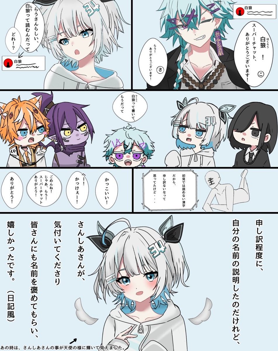 ※注意※ わたくし、白狼のお名前が出てきます。 #びじ絵 #さんしあーと び じ ぱ とさんの初配信にて、読み方気付いて貰えて嬉しかったので日記(笑)描かせていただきました snsaさん、気付いて下さりありがとうございました! そしてメンバーの皆さんお名前褒めて下さりありがとうございます! pic.x.com/PoRHS96gMH