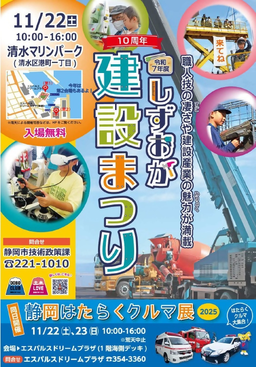 \しずおか建設まつり開催🚧/ 📅11/22㈯ 10:00~16:00 📍清水マリンパーク、水上交番前 今年も開催✨ クレーン車や高所作業車などの体験乗車 ARやVR体験、鉄筋工や配筋工などの 職業体験など、子どもから大人まで 幅広い年代層まで楽しめます! 詳しくはこちら▼ city.shizuoka.lg.jp/s6295/s012382.… #静岡市