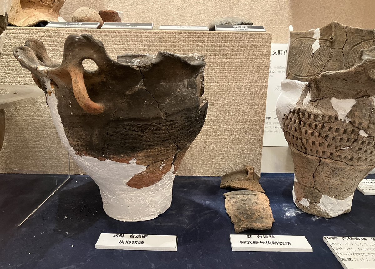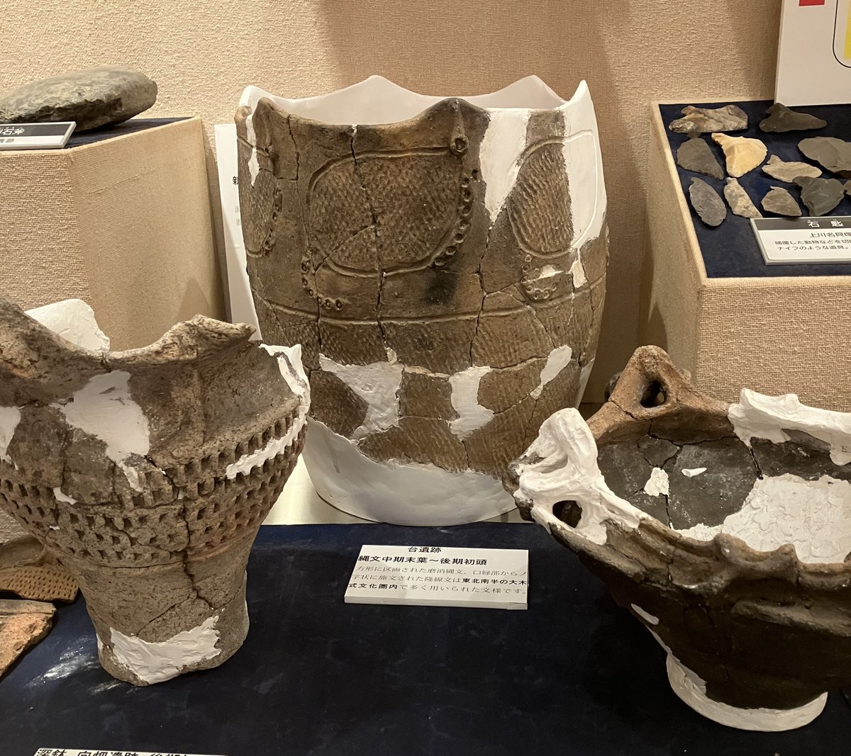常設展示(主に縄文~弥生)その②は縄文土器の展示。 3⃣の土器は #村田町歴史みらい館 常設展示の姥沢遺跡出土深鉢に似た紋様の大木10式後継土器。 4⃣の土器のキャプションに「三十稲場式」の文字列が入りました。😊 x.com/YoshiHR2/statu… #しばたの郷土館 pic.x.com/gl1ZZJMj91